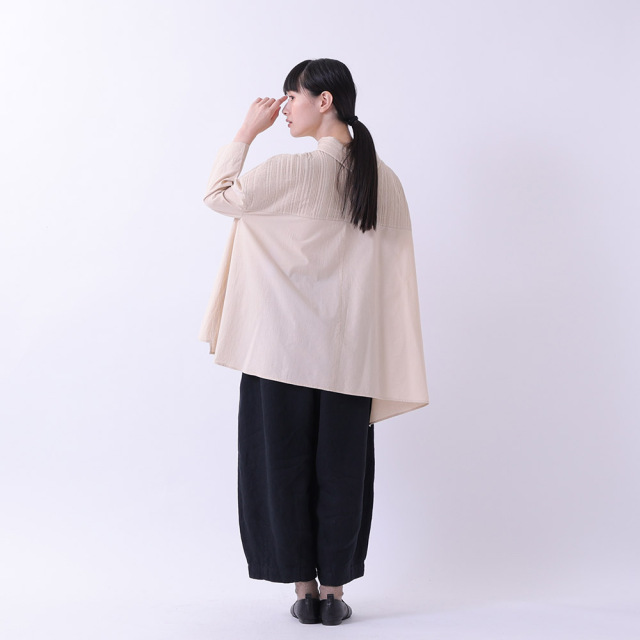大きめのロールカラーにもピンタックを施した細部にもこだわったディティールがポイント。