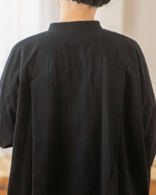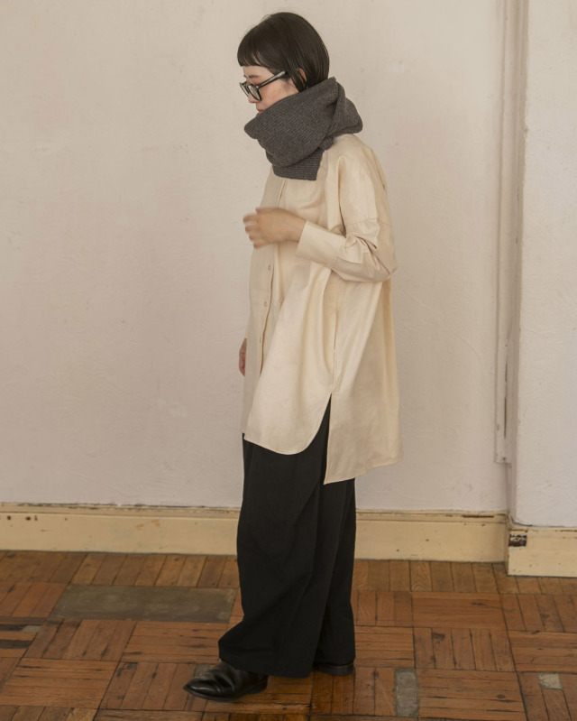 細めのバンドカラーは、ボタンを閉じれば端正に、開けてタートルを重ねればこなれ感のあるレイヤードスタイルに。