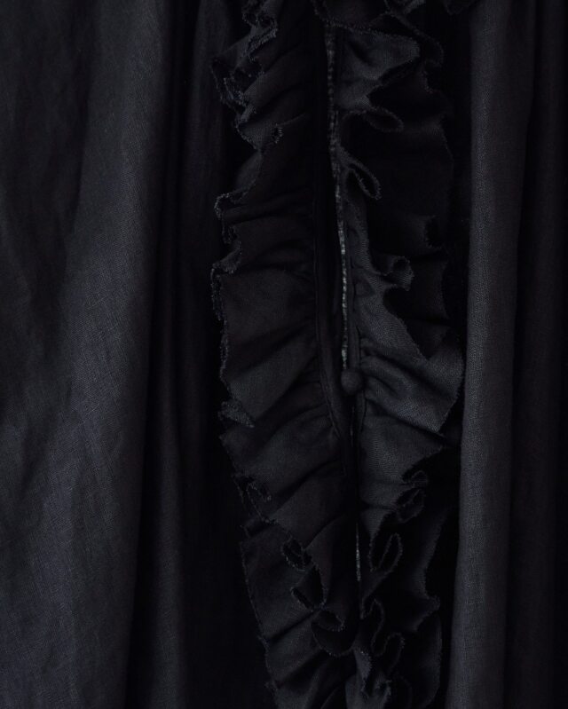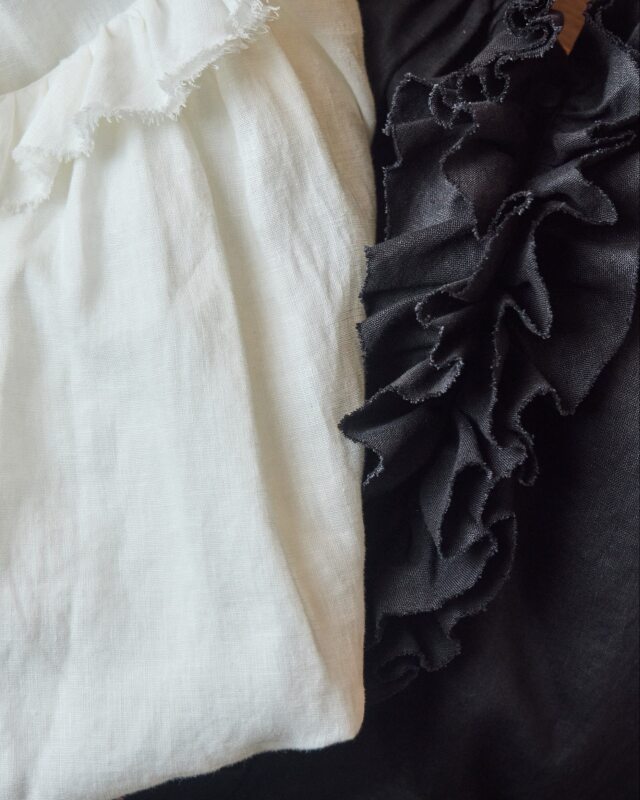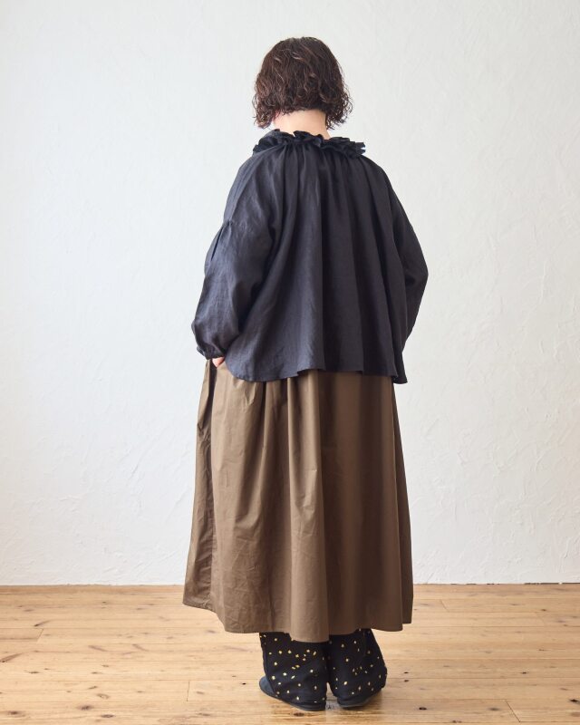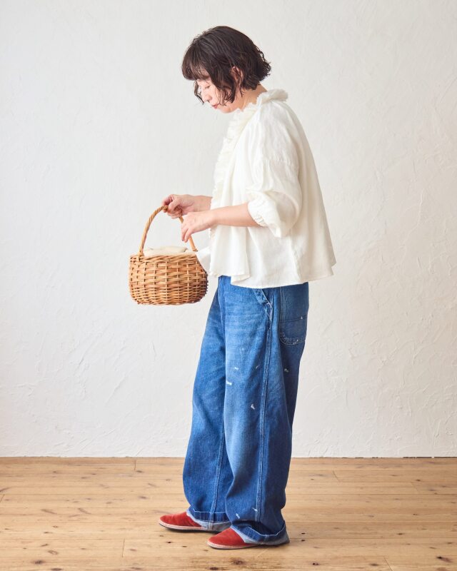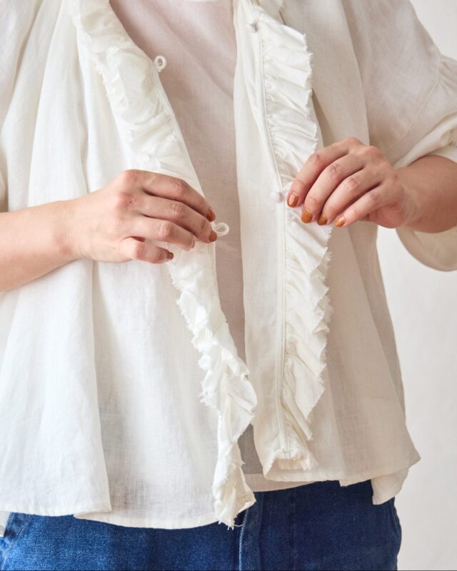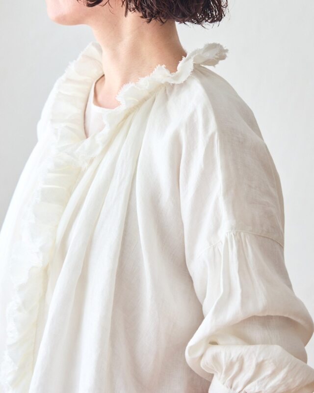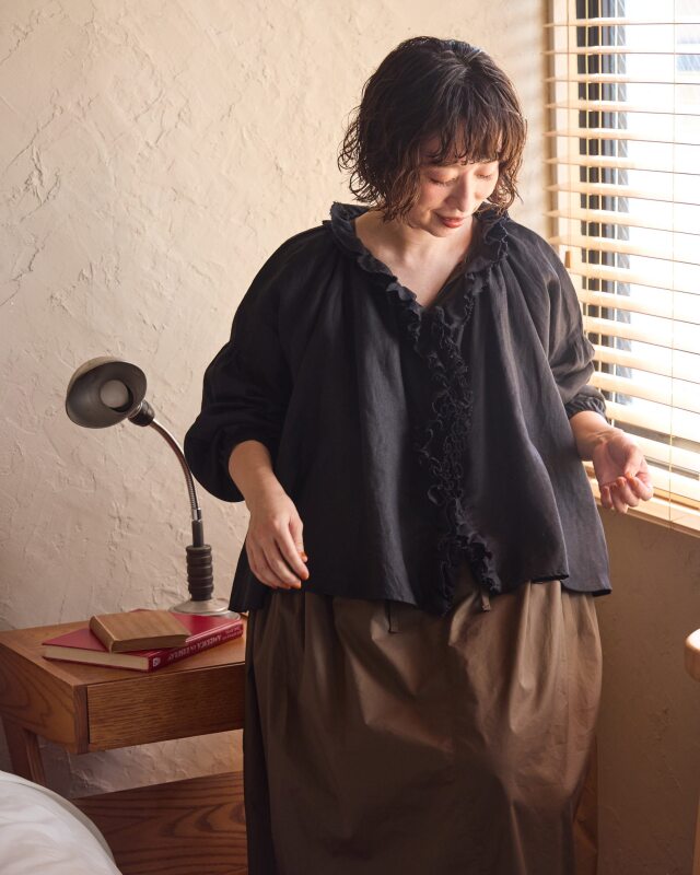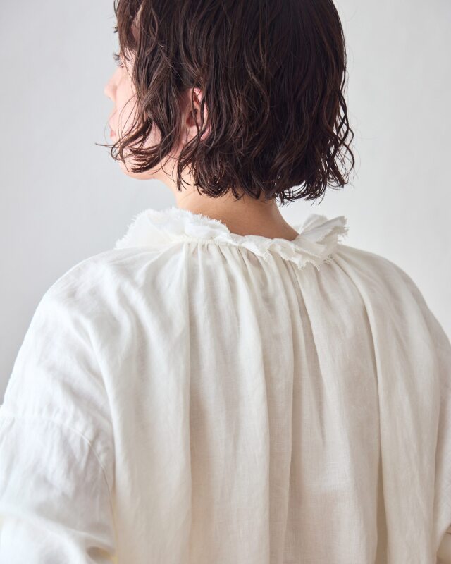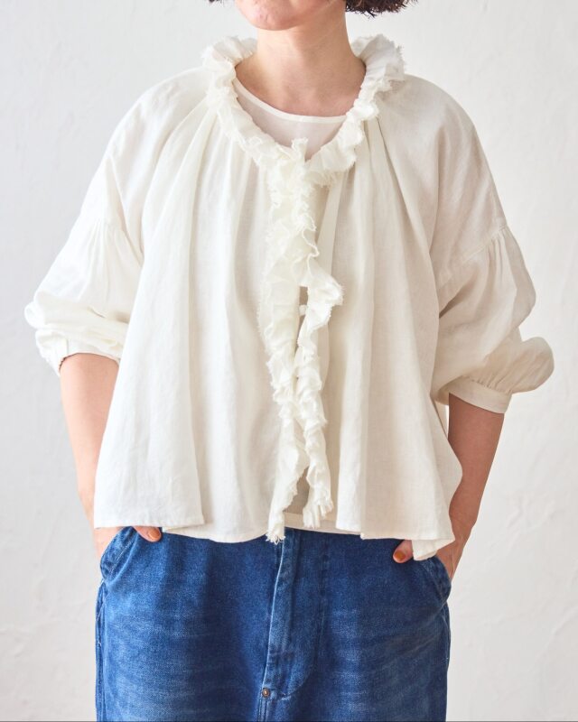 彼女とのコラボレーション第4弾の中でも特にご好評いただいたのが、こちらの「リネンエアーウォッシュフリルブラウス」 です。