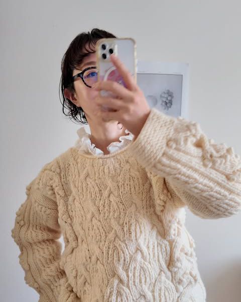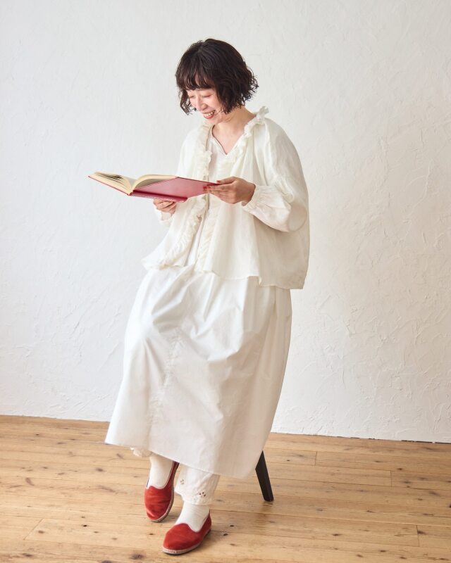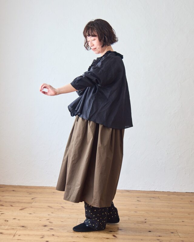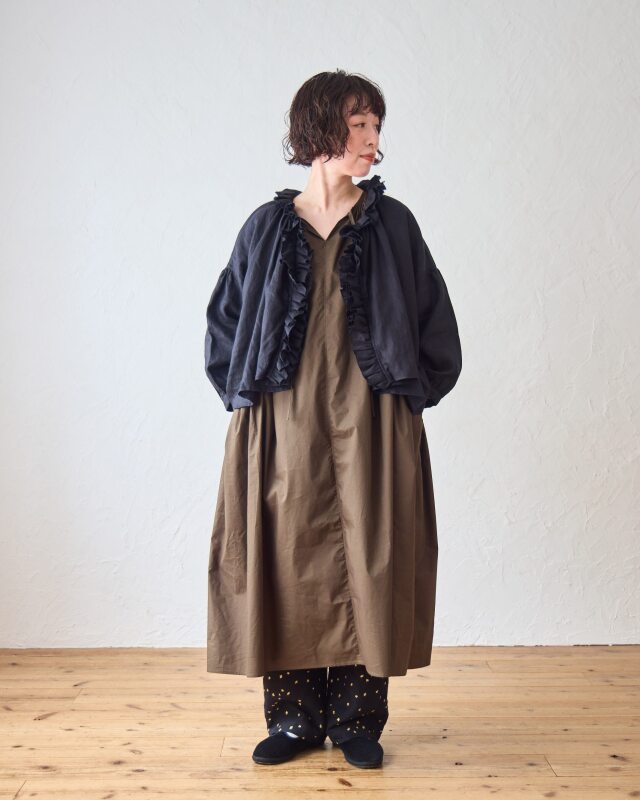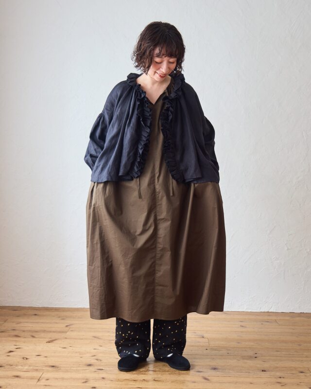 フロントにはボタンを付けているので、ボタンを留めて顔まわりを華やかに見せたり、開けて羽織りとしてふんわりと着ることもできます。