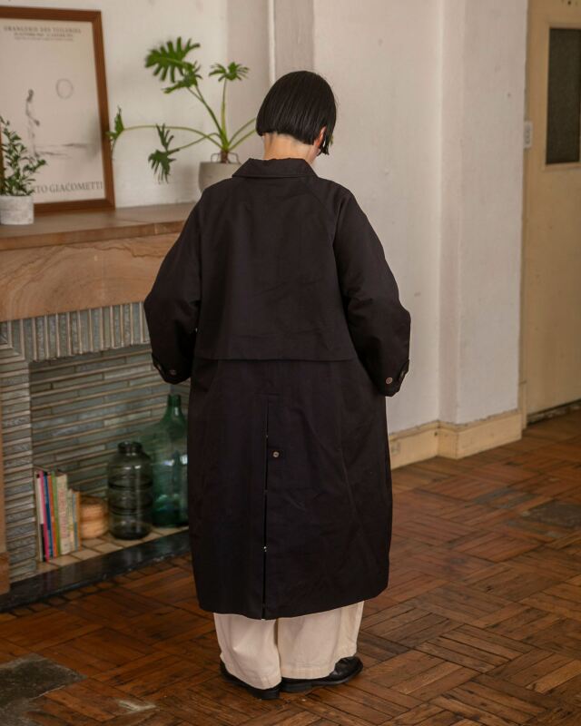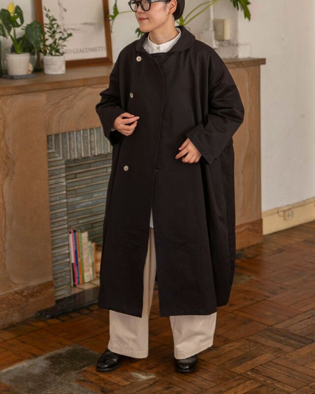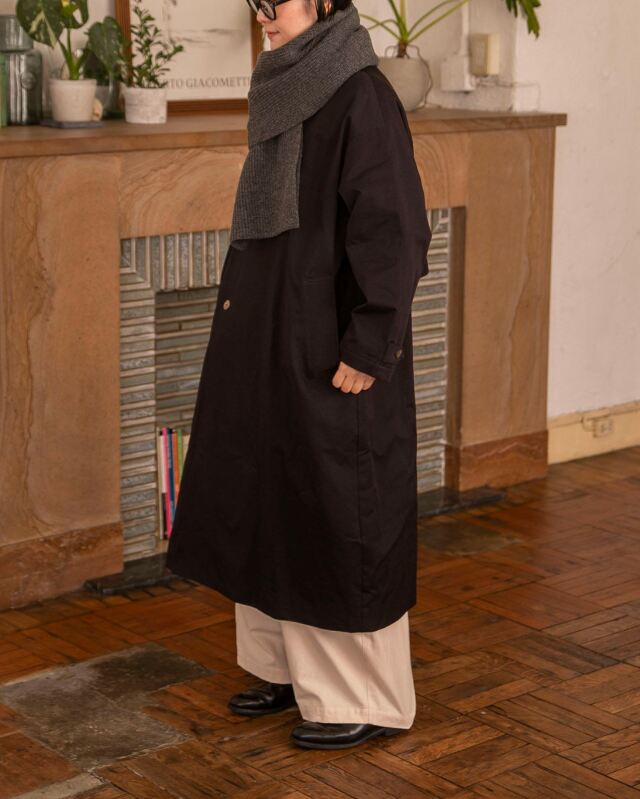 他のスタッフが着用した後ろ姿もとても可愛らしく、肩の落ち感やゆったりとした袖のフォルムも絶妙。リラックス感がありつつ、着ぶくれせずすっきり見える、不思議な魅力のあるコートです。