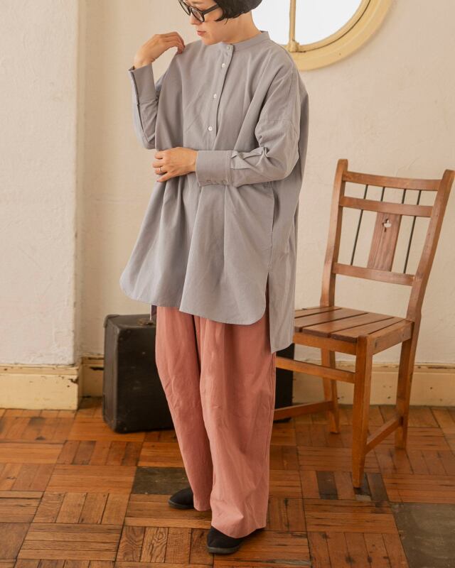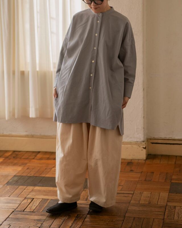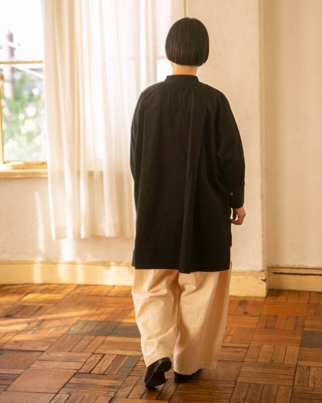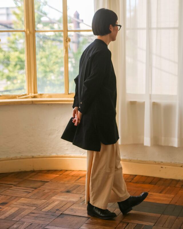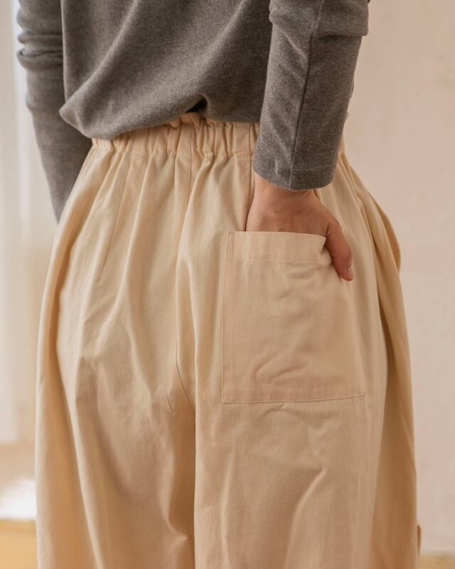 前後に入れた深めのタックとギャザーが立体感を生み、ワイドながらも美しくまとまり、穿くだけで“様になる”一本です。