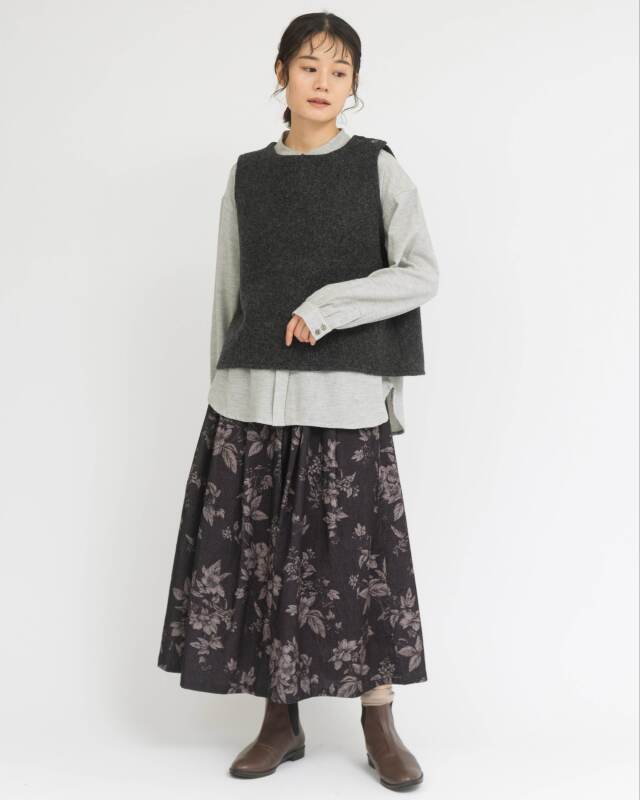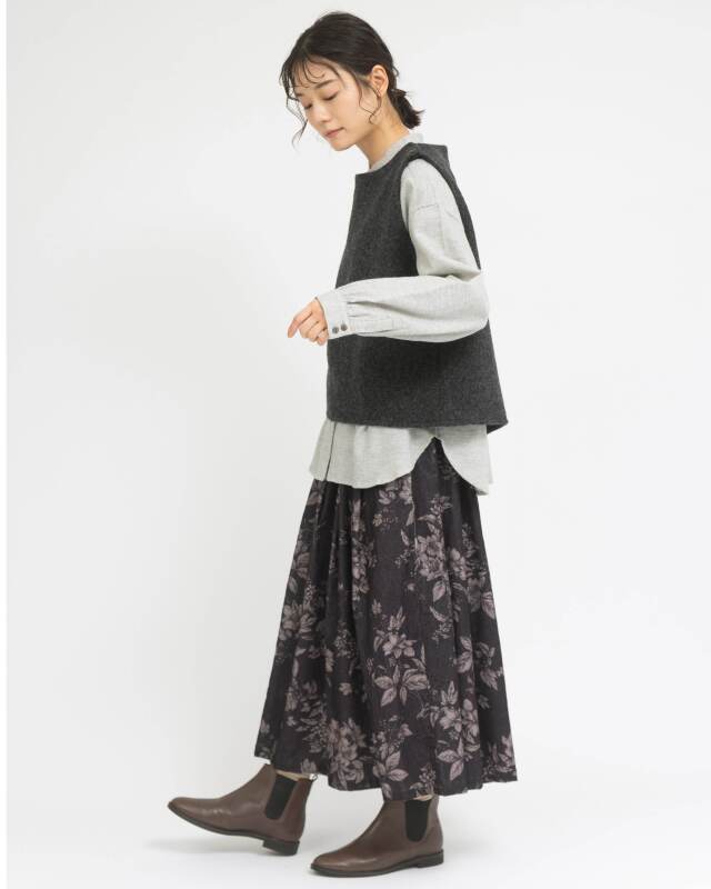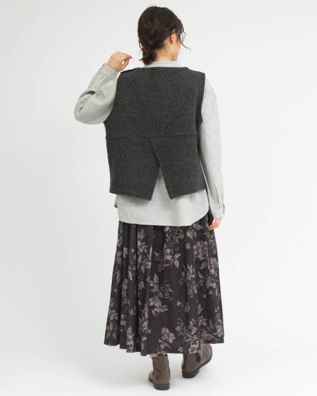 バックスタイルは切替下から生地が重なったスリット仕様になっており、動きに合わせて自然に揺れる立体的な表情を楽しめます。
