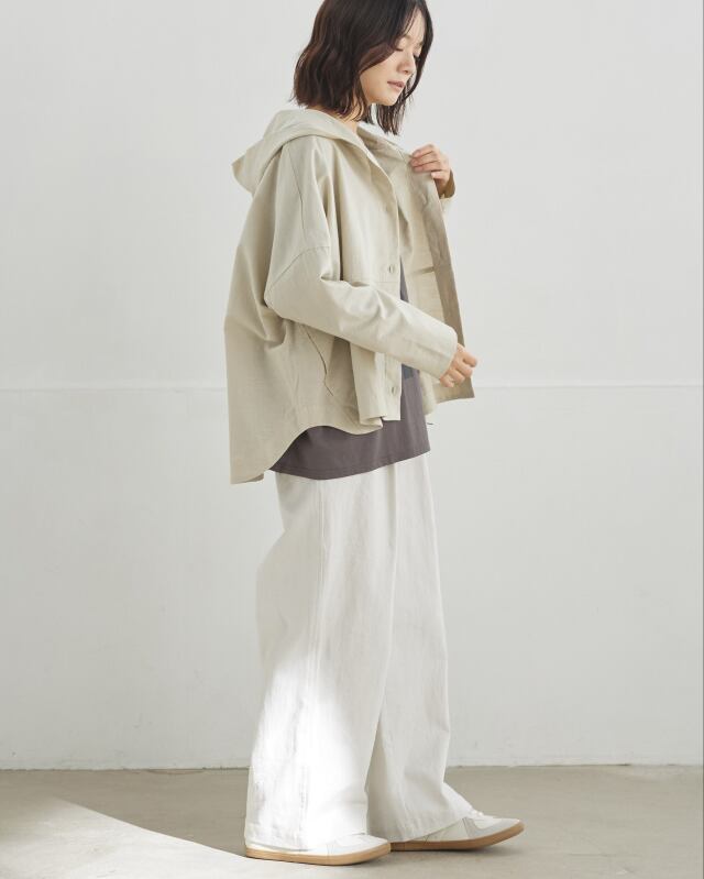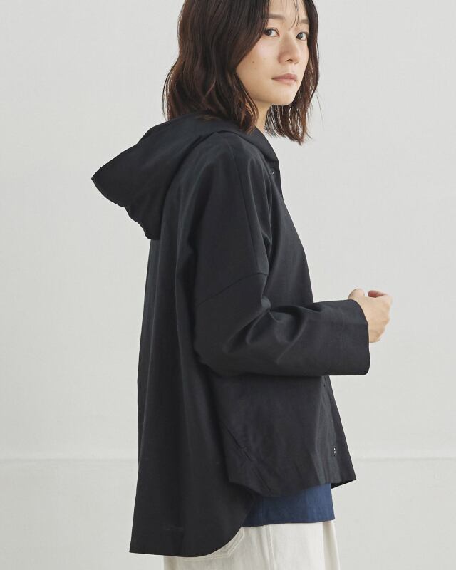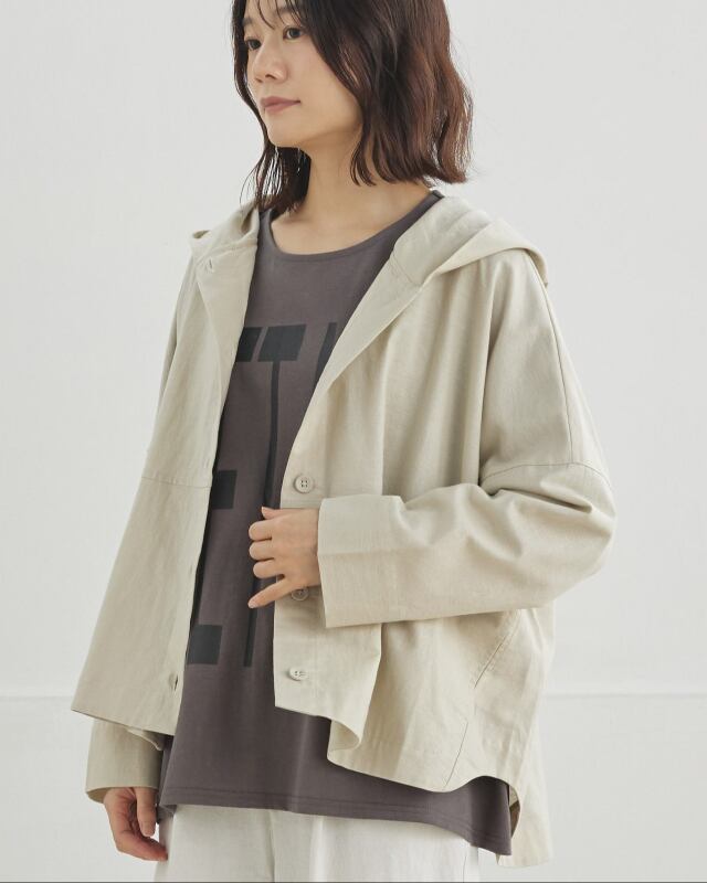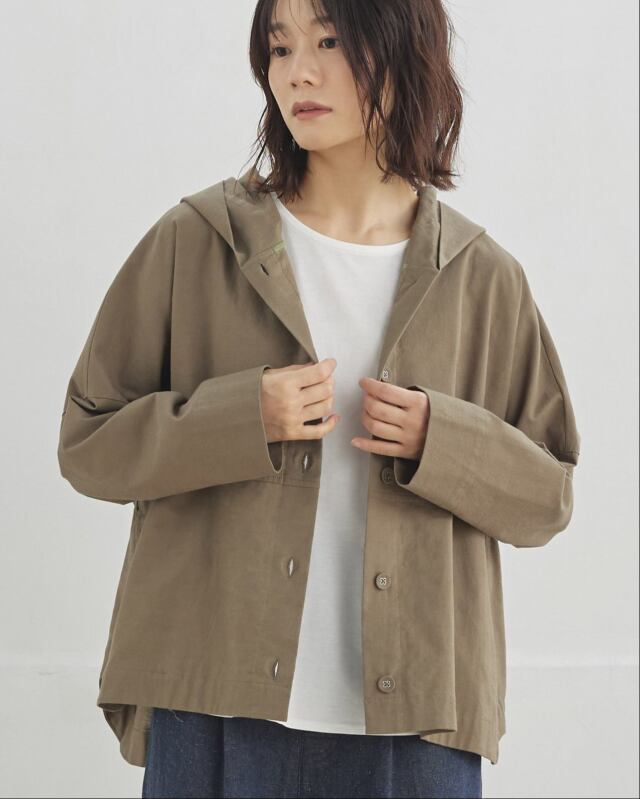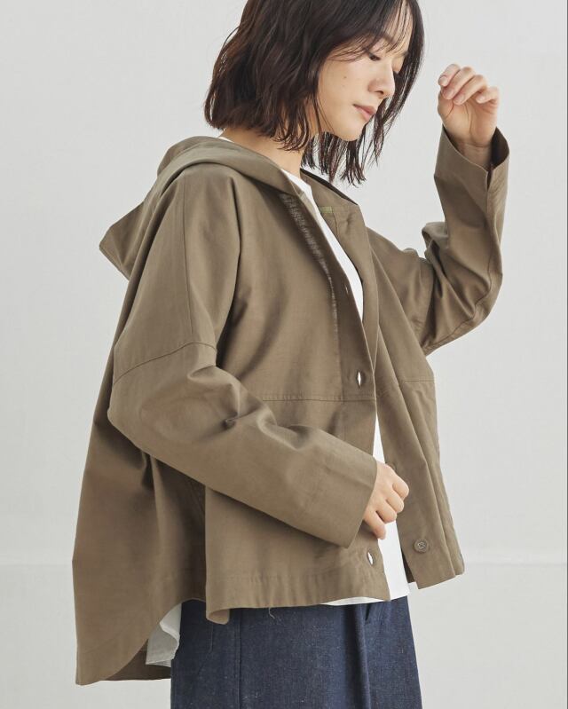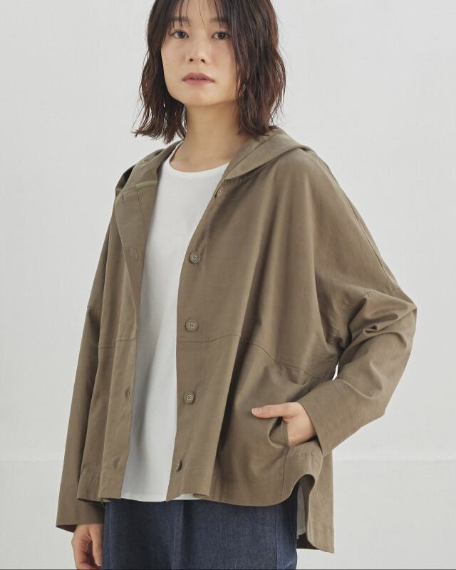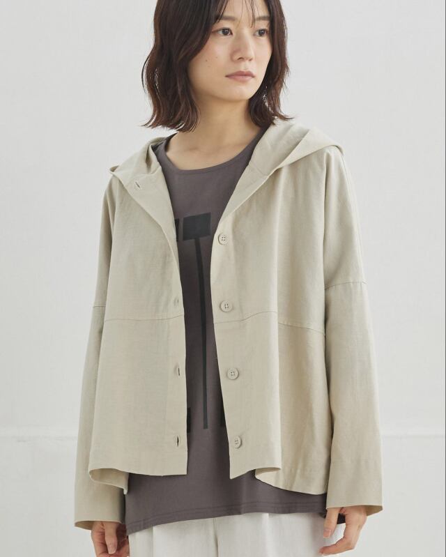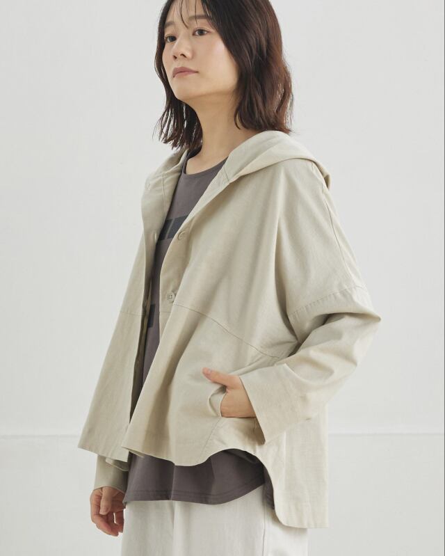 程よくゆとりのあるシルエットに、前開きの釦仕様とフードをプラス。カジュアルな要素を取り入れながらも、軽やかで上品な印象に仕上げています。気温差のある日にも、さっと羽織れる一枚です。
