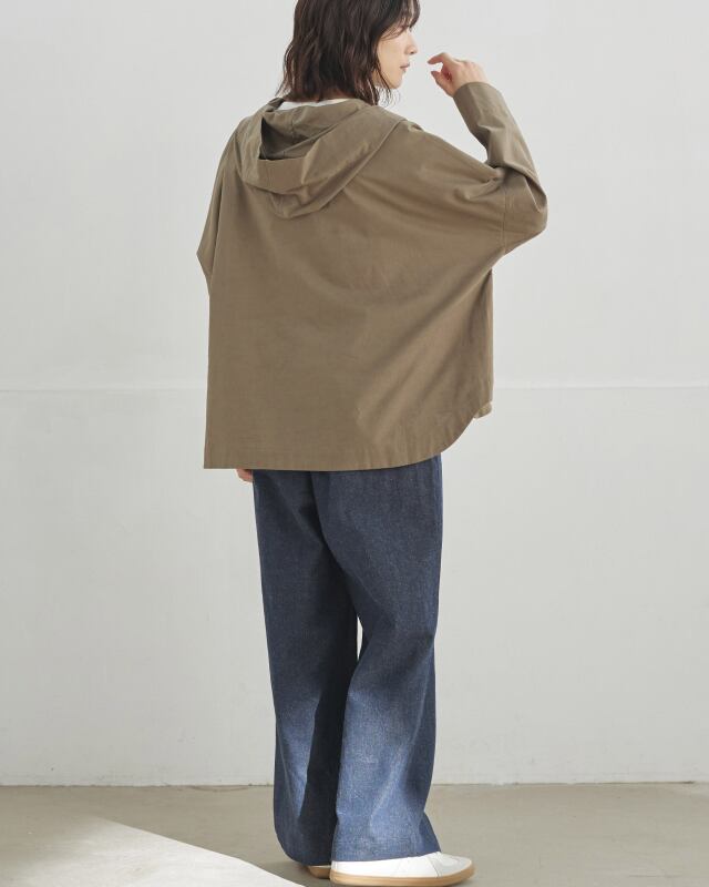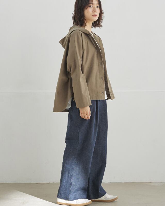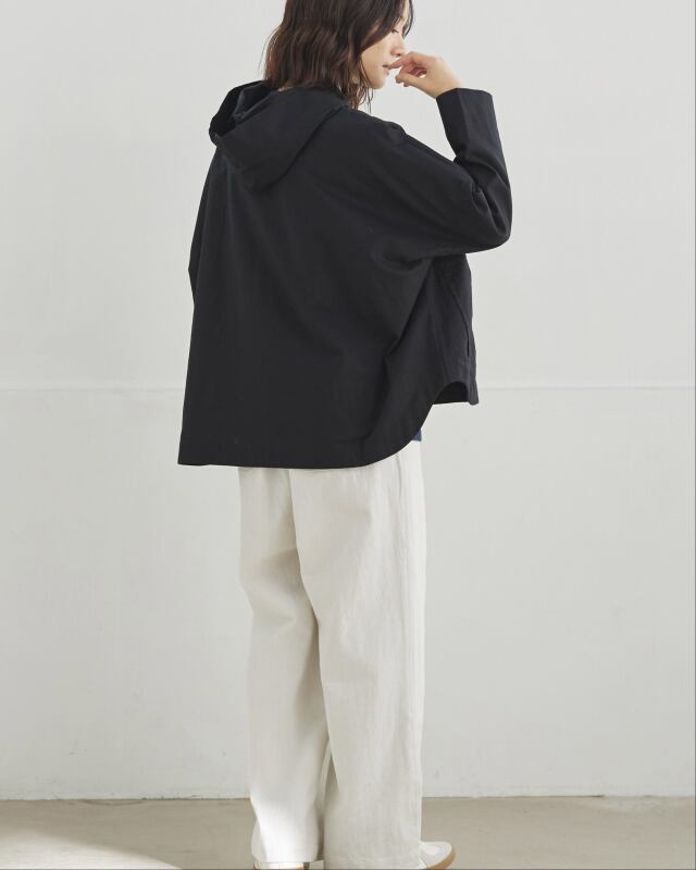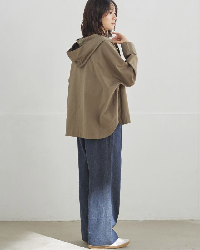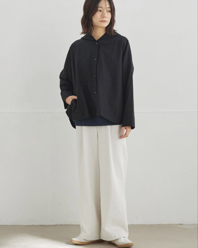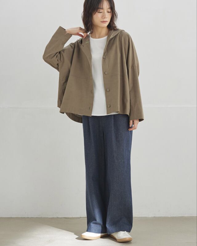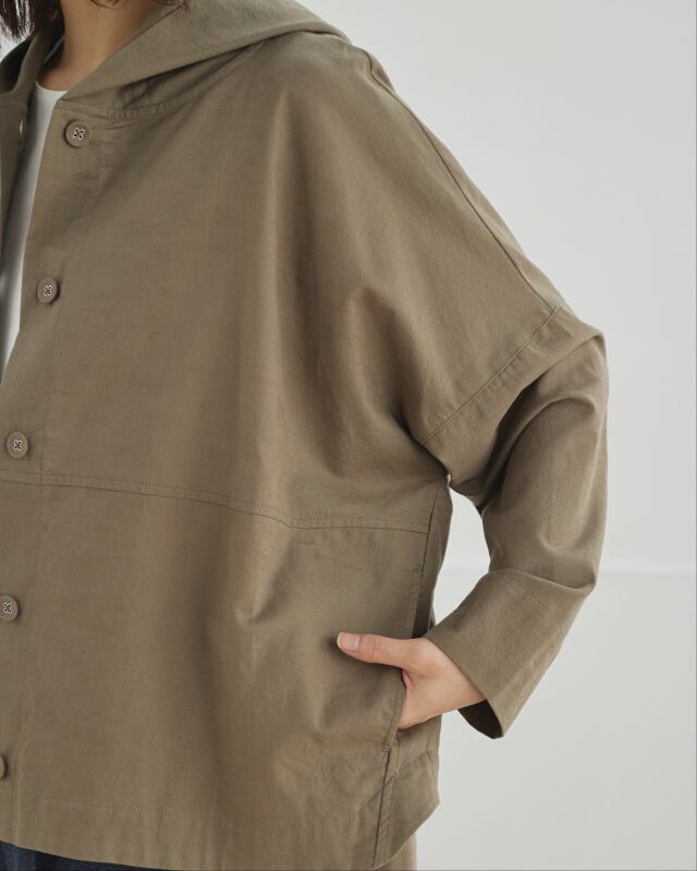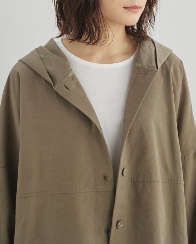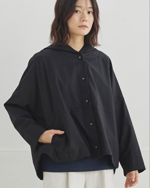 程よくゆとりのあるシルエットに、前開きの釦仕様とフードをプラス。カジュアルな要素を取り入れながらも、軽やかで上品な印象に仕上げています。気温差のある日にも、さっと羽織れる一枚です。