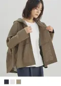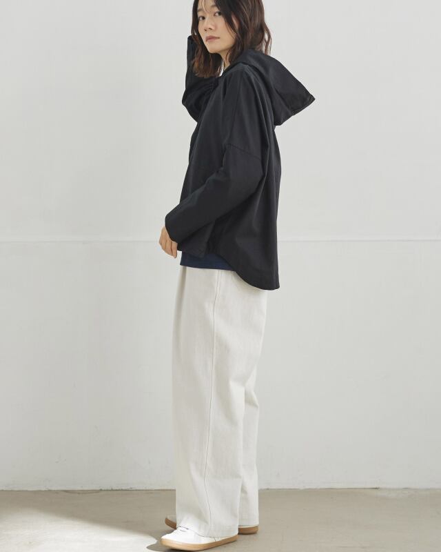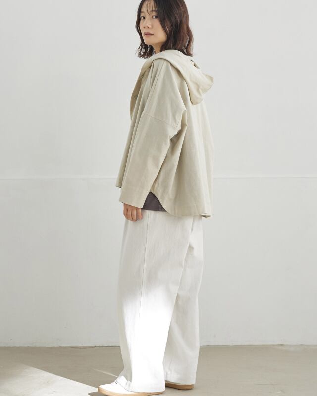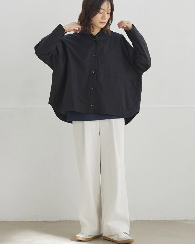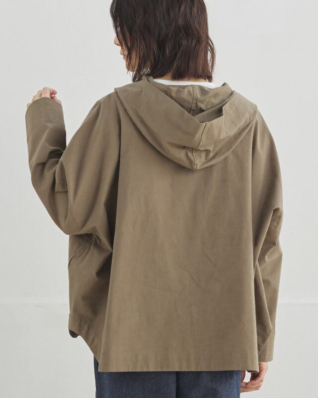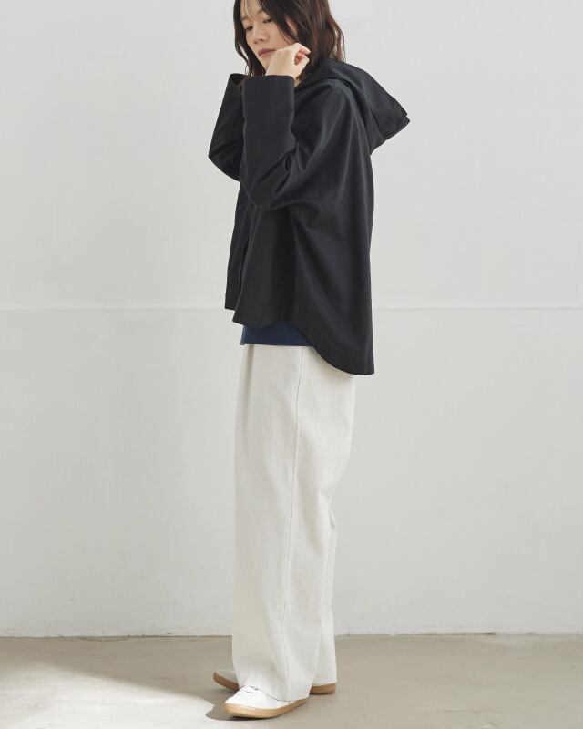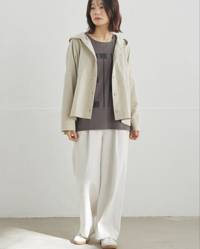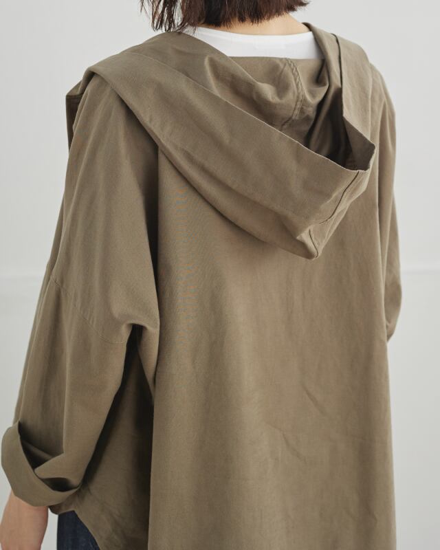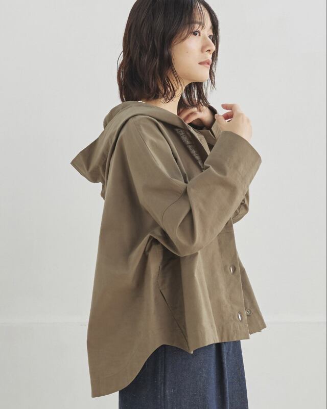 程よくゆとりのあるシルエットに、前開きの釦仕様とフードをプラス。カジュアルな要素を取り入れながらも、軽やかで上品な印象に仕上げています。気温差のある日にも、さっと羽織れる一枚です。