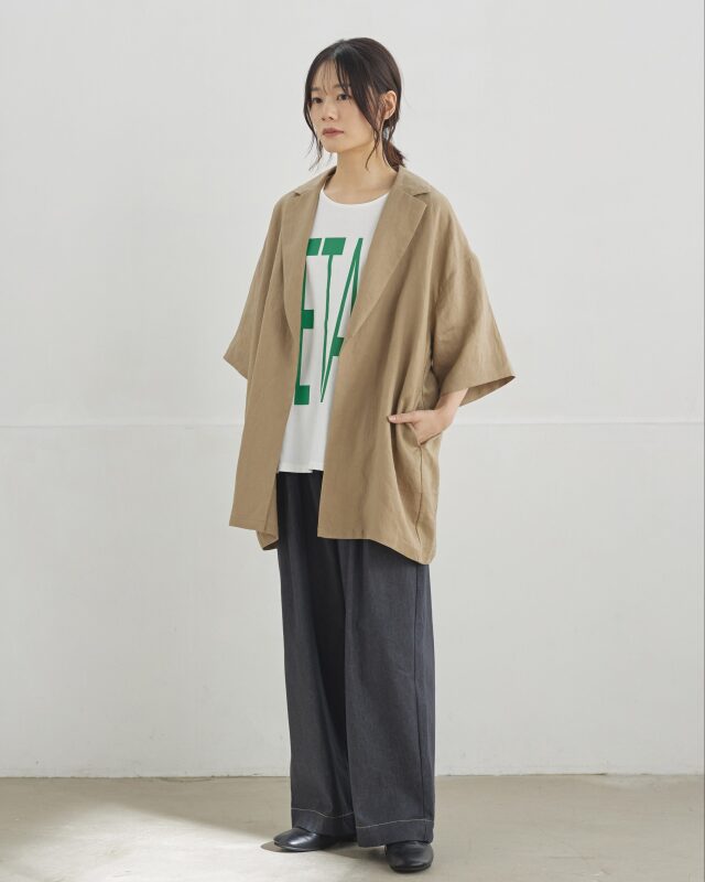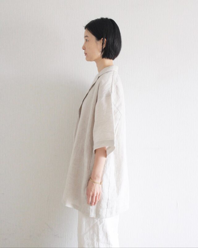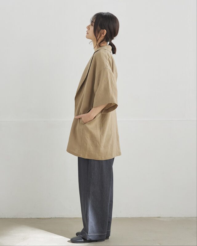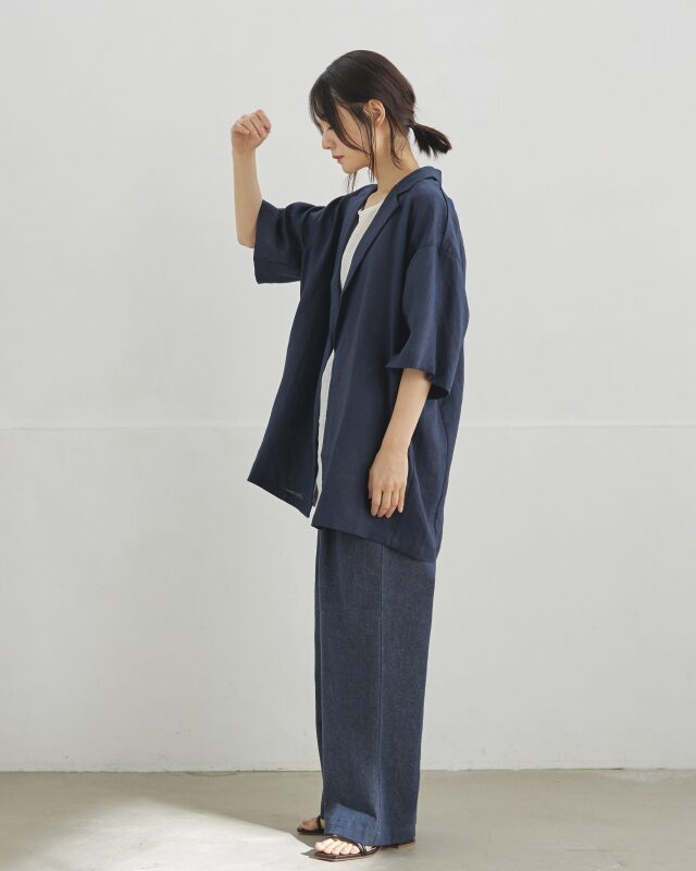 テーラードの端正な佇まいに五分袖のデザインを合わせました。きちんと感の中に程よい抜けを感じるシルエットです。重ね着しやすく軽く羽織るだけで装いが整います。