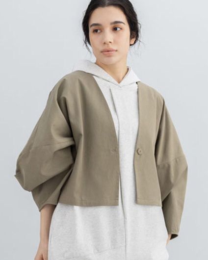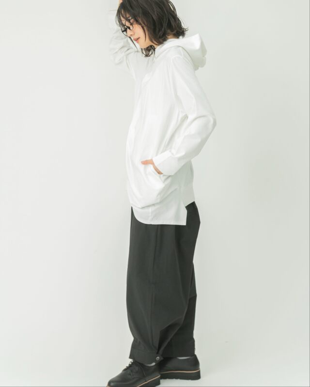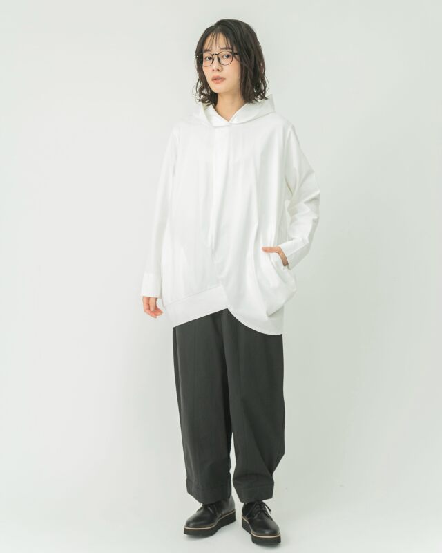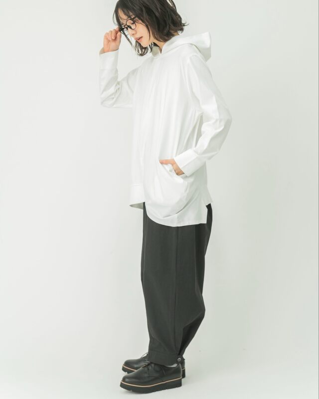 球体をイメージした立体的なパターンワークで、着用すると自然な落ち感が生まれ、見る角度によって見え方が変化するデザインになっています。