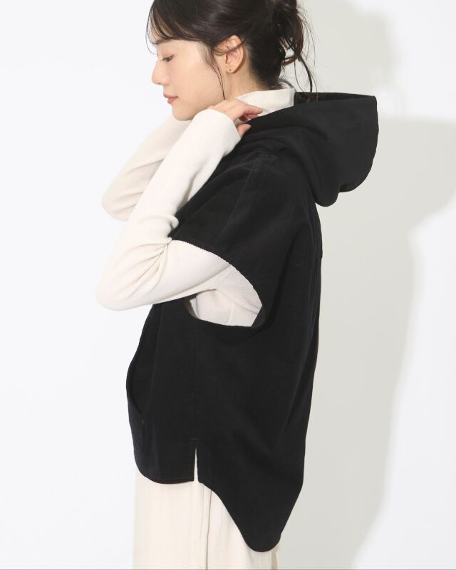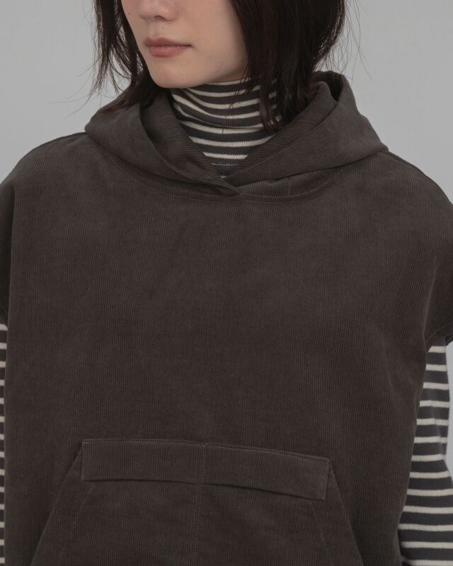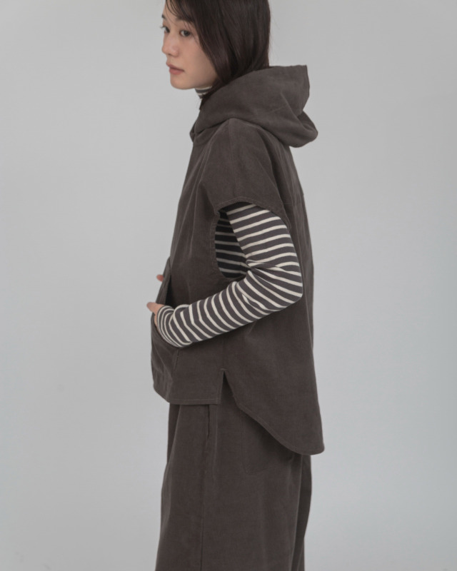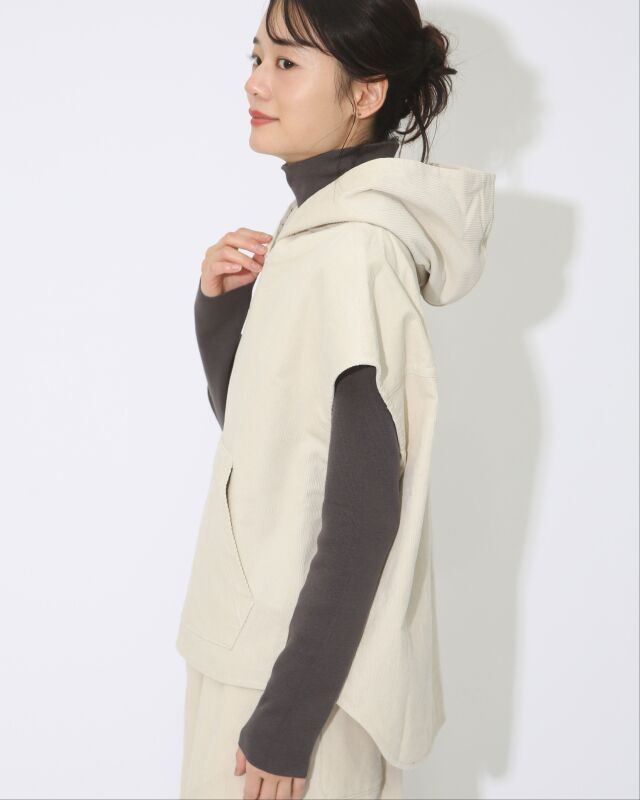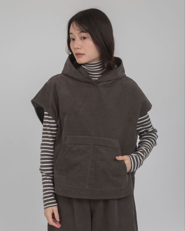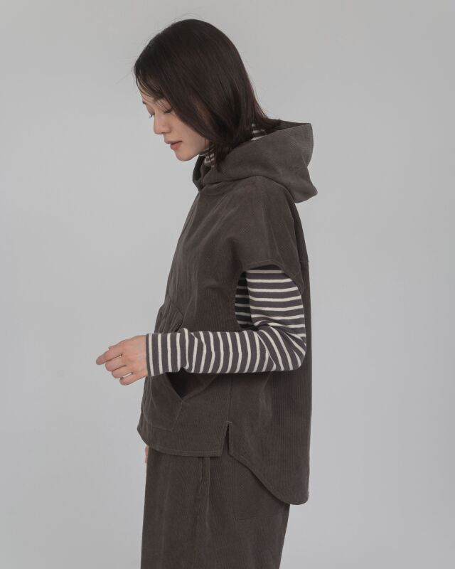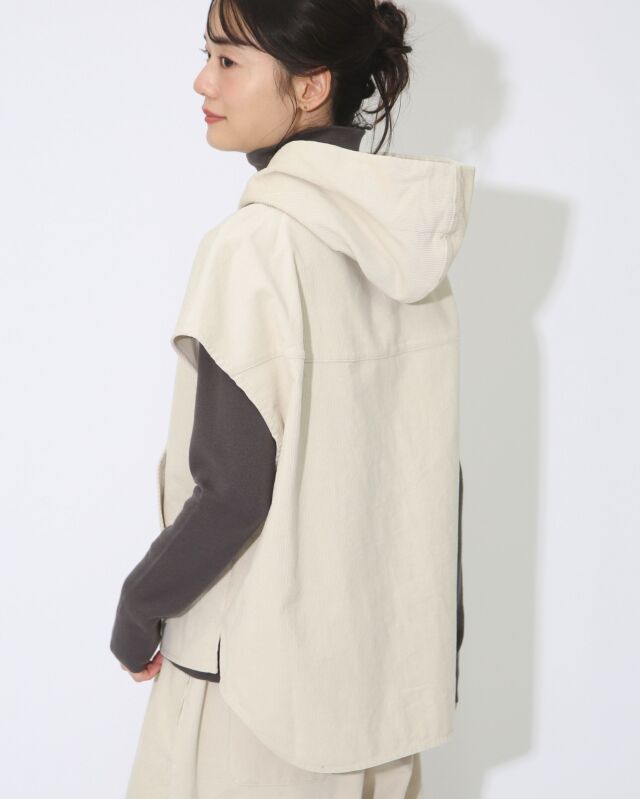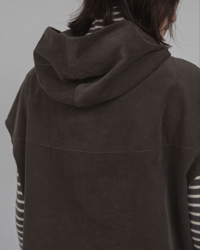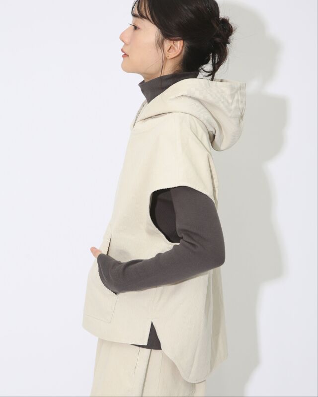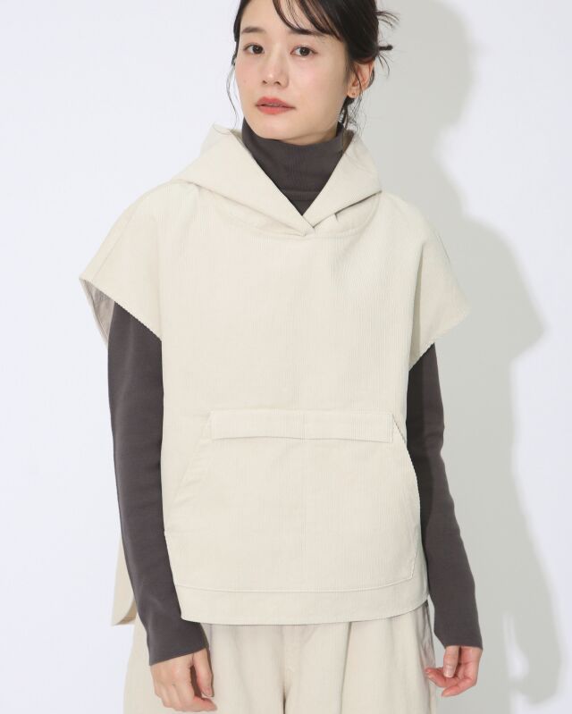 コットンのコーデュロイ素材を使用した、表情豊かなフード付きプルオーバーベスト。