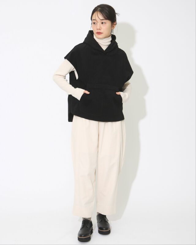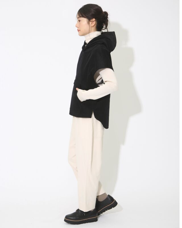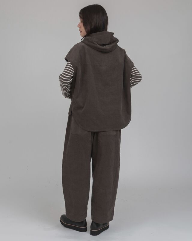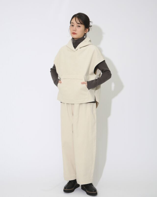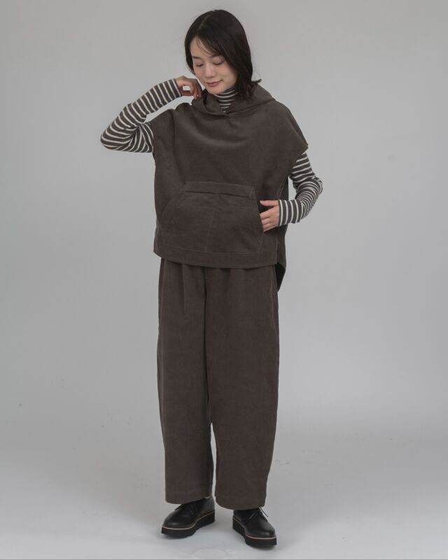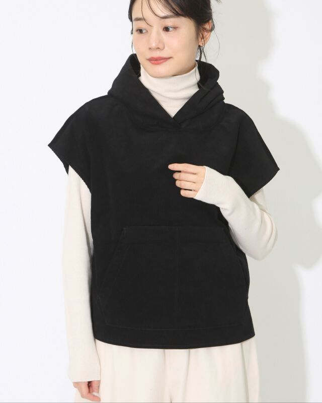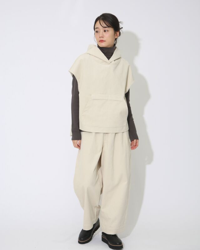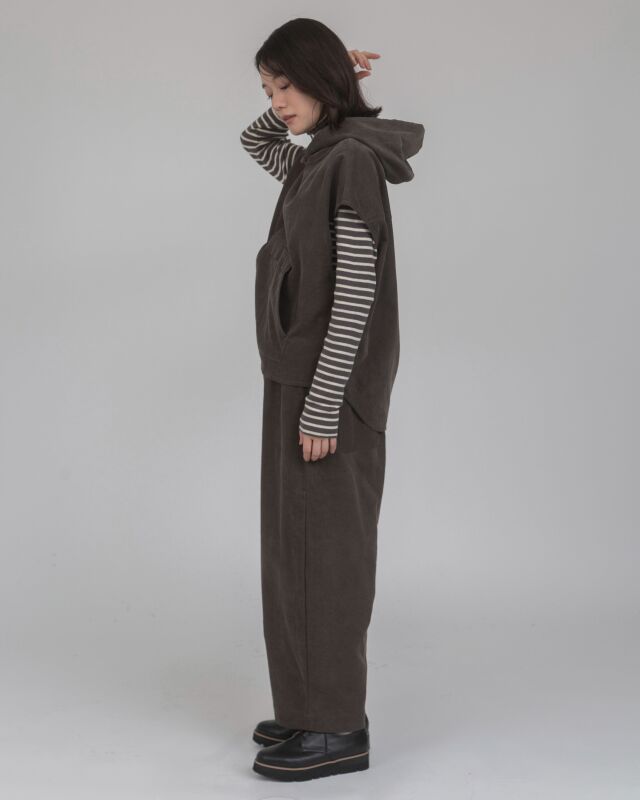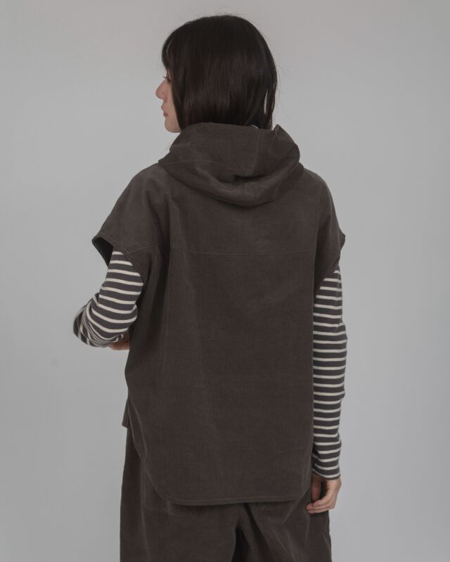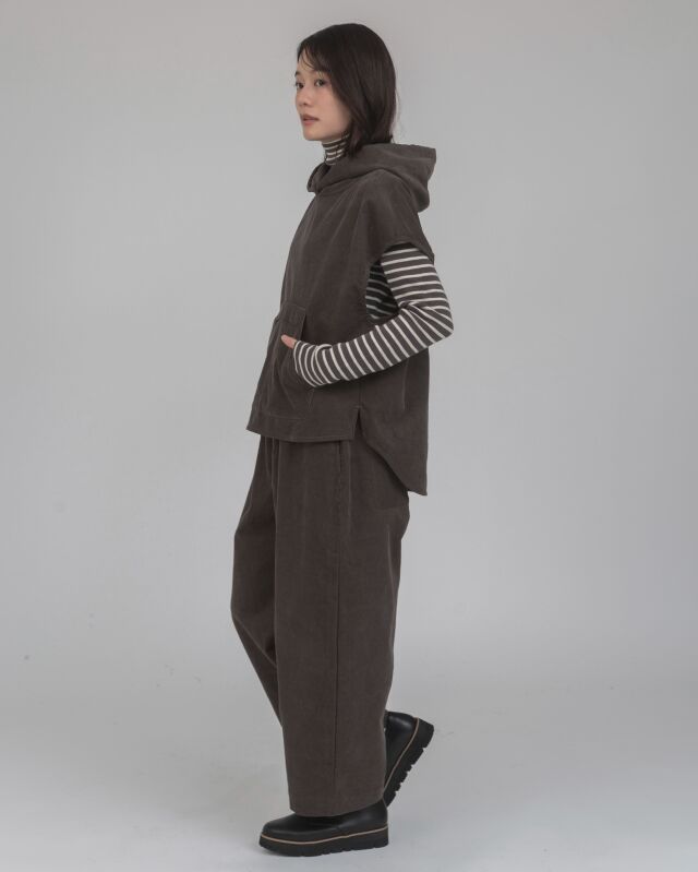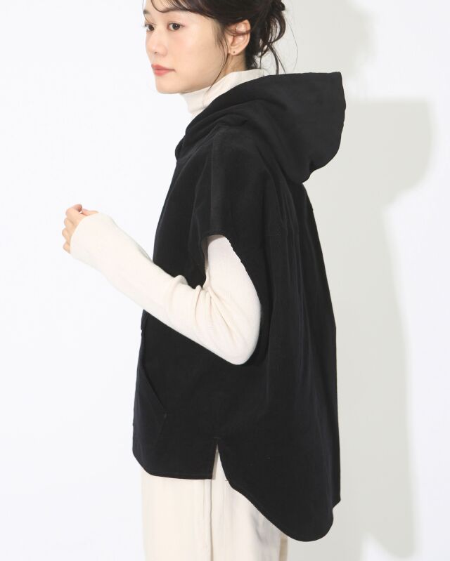 コットンのコーデュロイ素材を使用した、表情豊かなフード付きプルオーバーベスト。