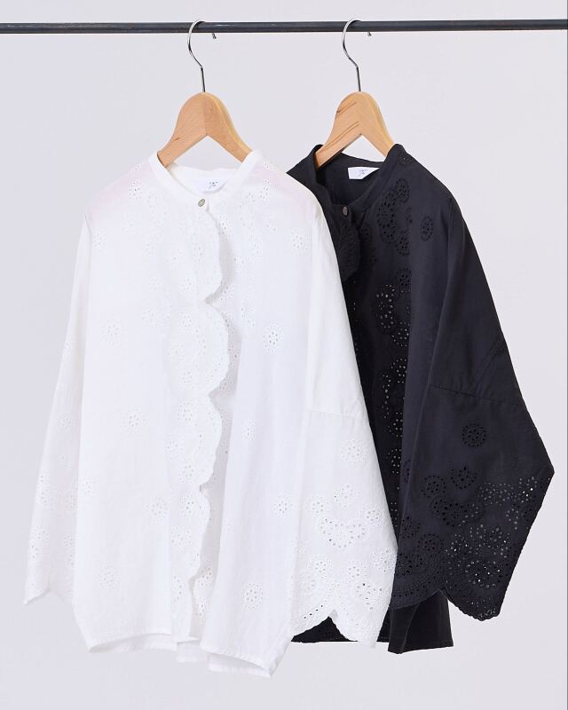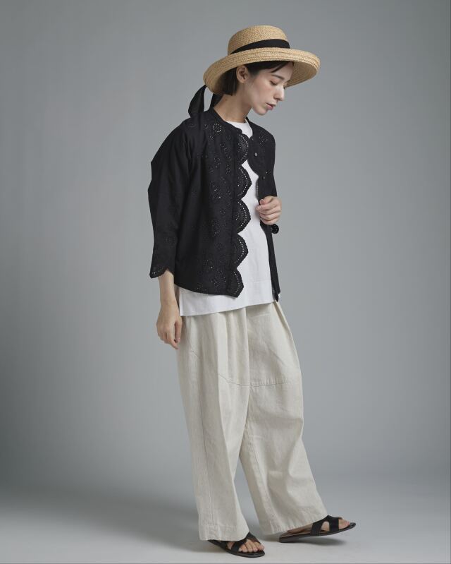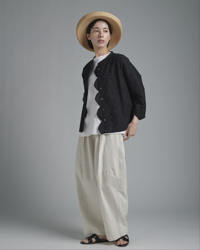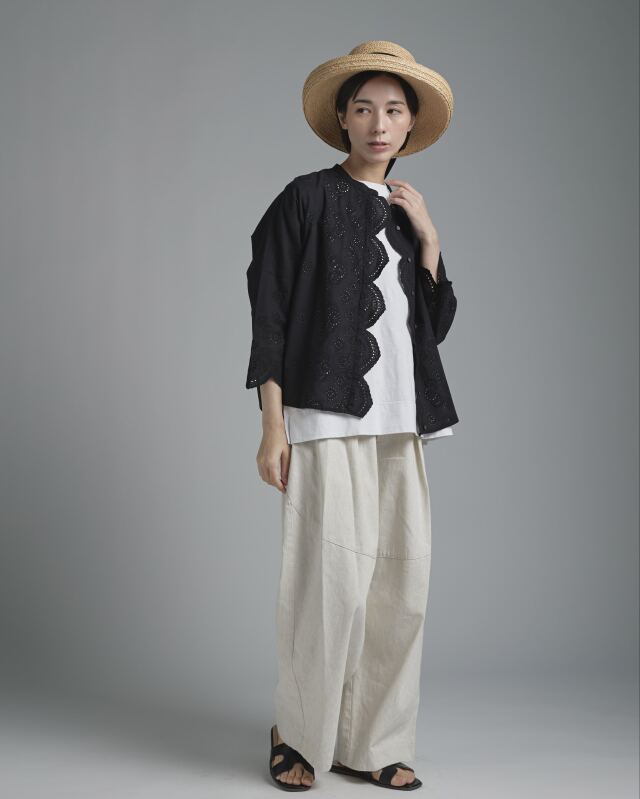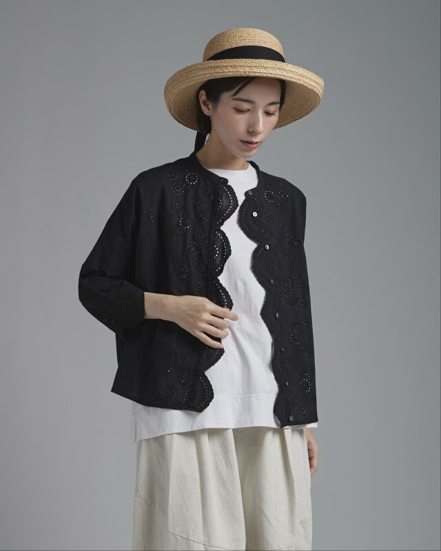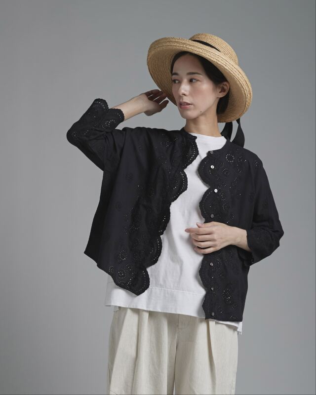 小花の刺繍を施した綿レース素材を使用。波状にカットされたスカラップが、やわらかな陰影を生み出し、女性らしい表情を添えます。綿ならではの軽やかさがあり、肌に触れる感触も心地よく感じられます。