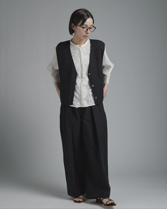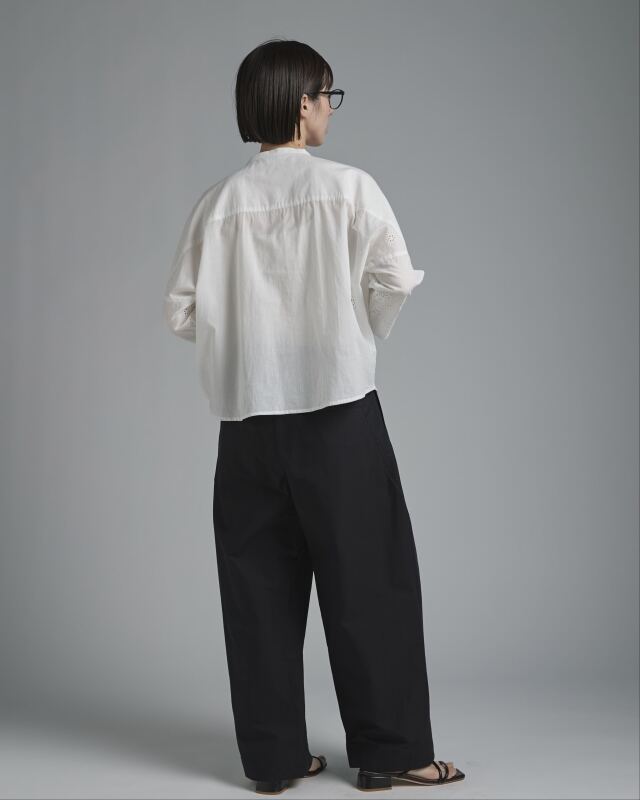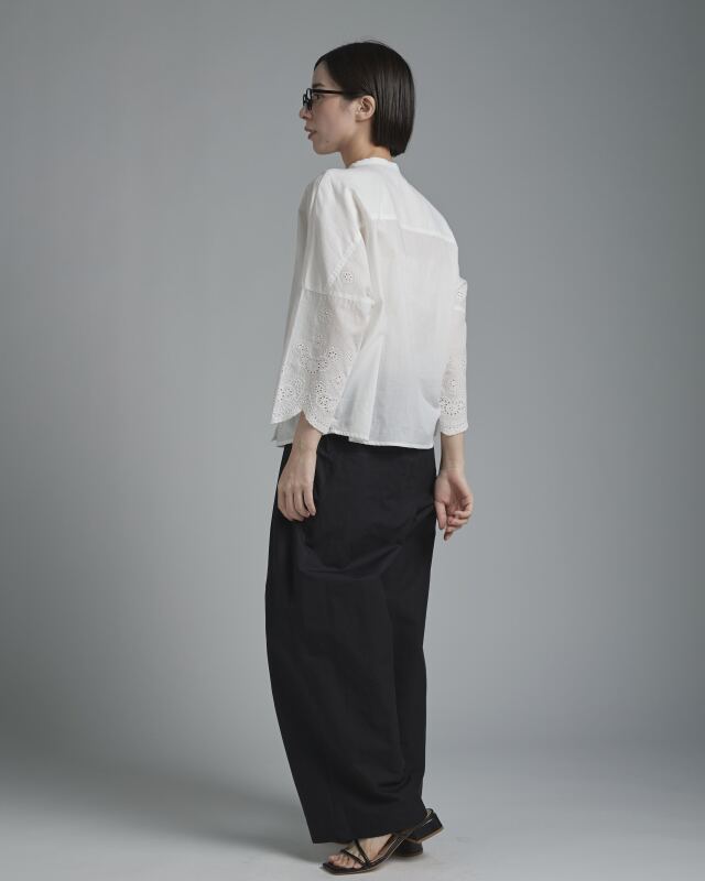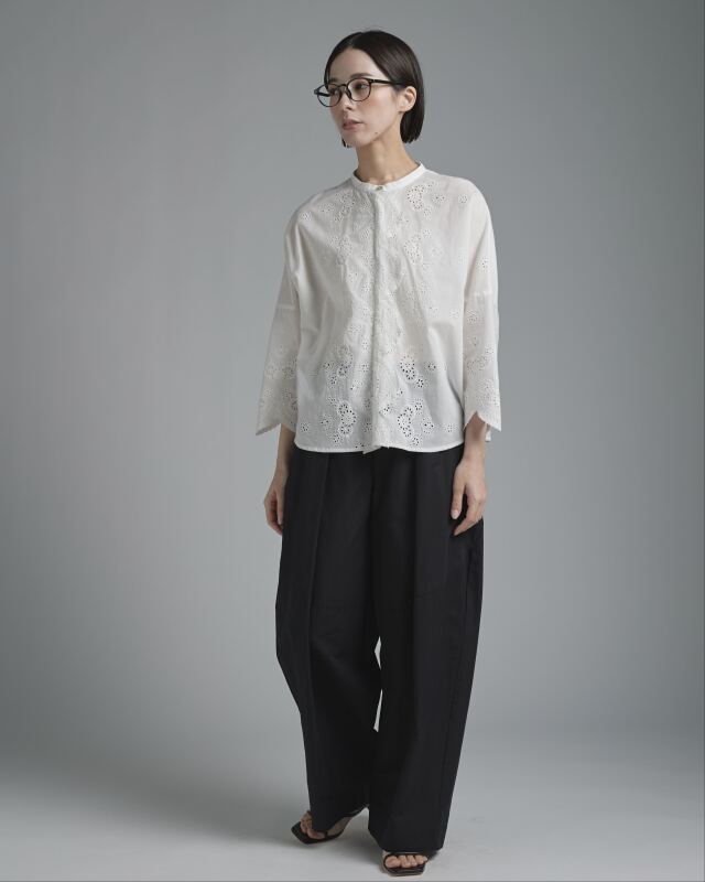 シルエットはすっきりとしたシンプルなブラウス。前端と袖口にレースをあしらうことで、控えめながらも華やかな印象に。レース柄が途切れないよう比翼仕立てにし、細部まで丁寧に仕上げました。