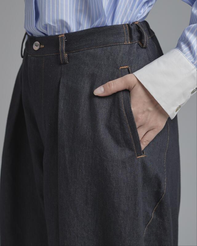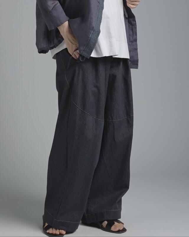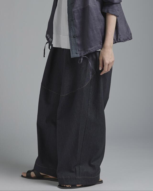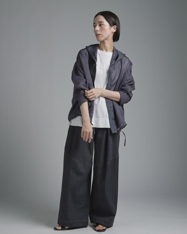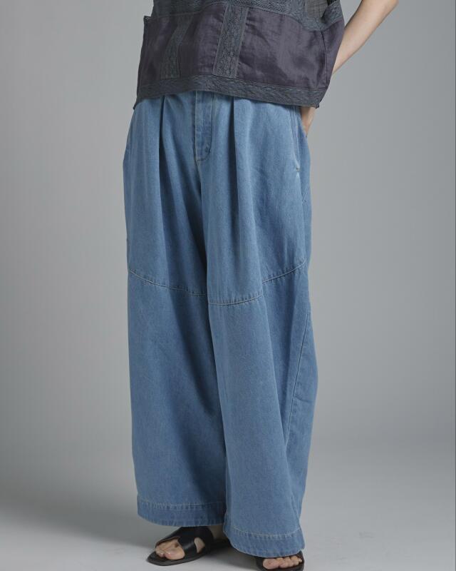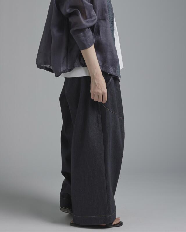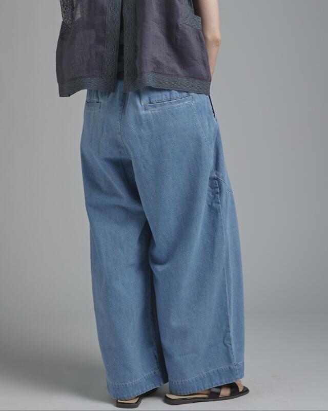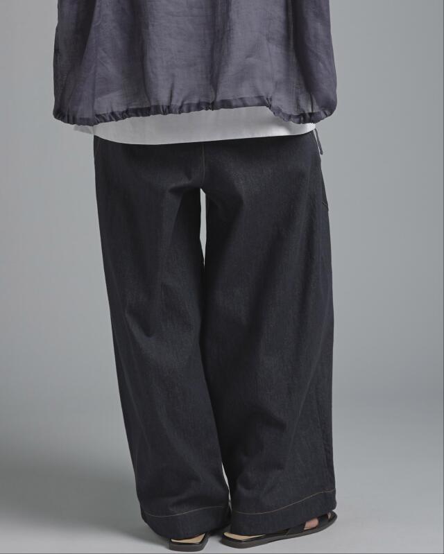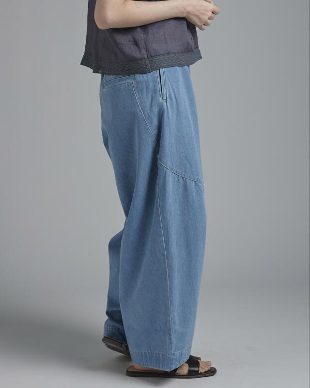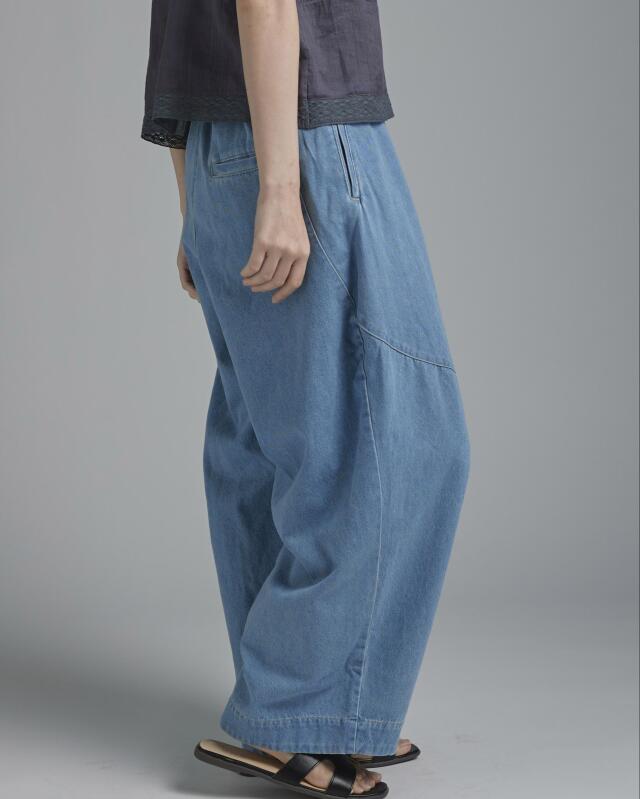 薄手で軽やかなデニム素材を使用し、やわらかな肌触りが心地よい一本です。デニムならではの表情を楽しみながら、季節を問わず取り入れやすい生地感に仕上げました。