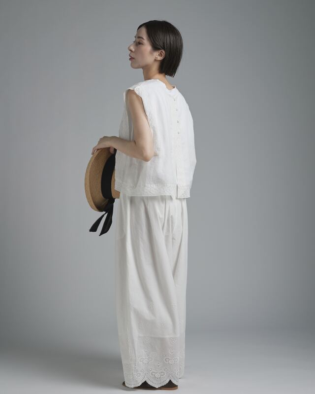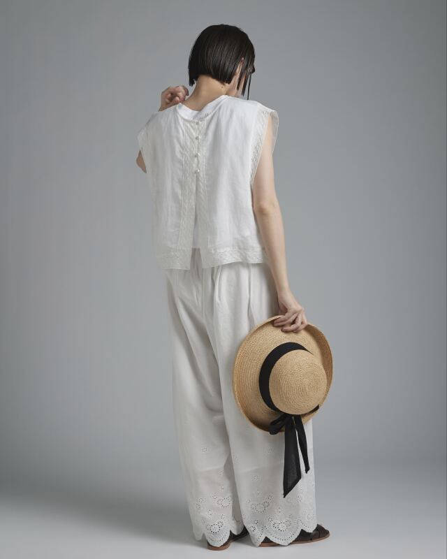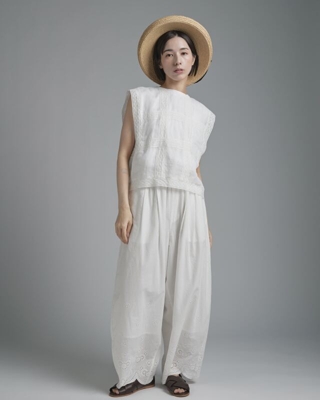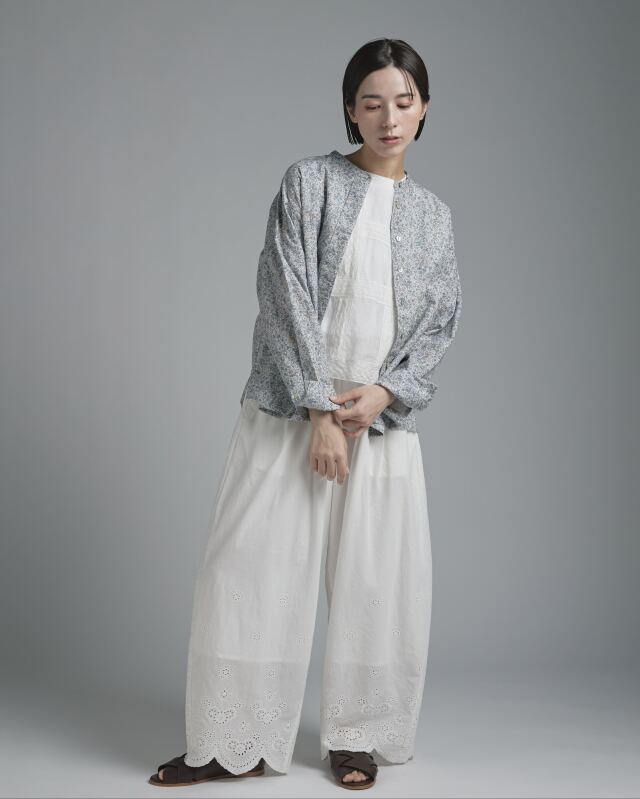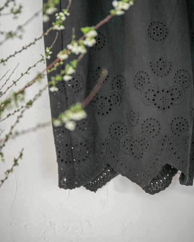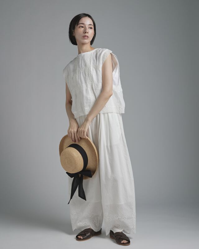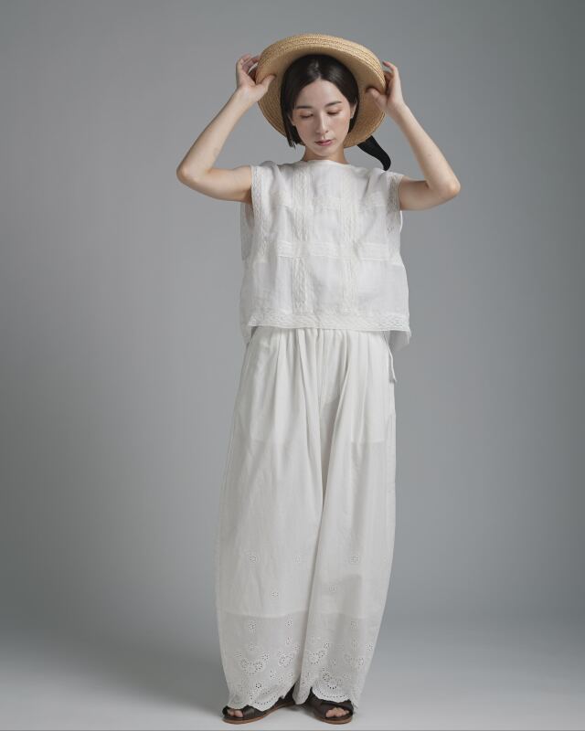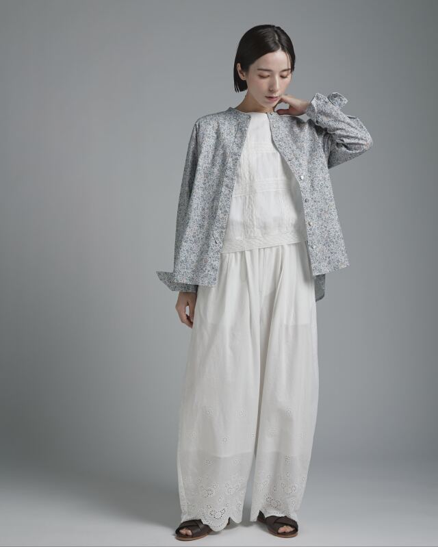 小花の刺繍と波状のカットが印象的な、綿レース素材を使用。やわらかな表情を持ちながら、綿ならではの軽さがあり、暑い季節にも心地よく取り入れられます。刺繍の陰影が控えめで、甘さを抑えた印象です。