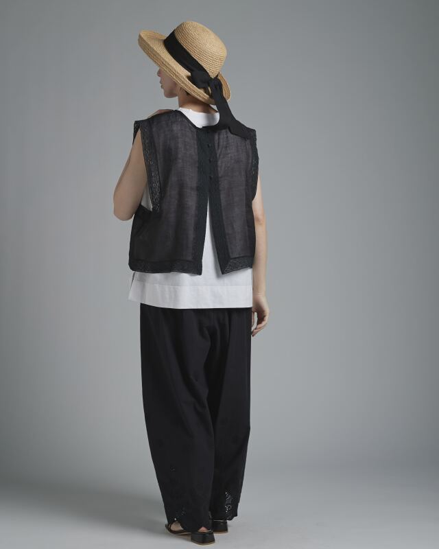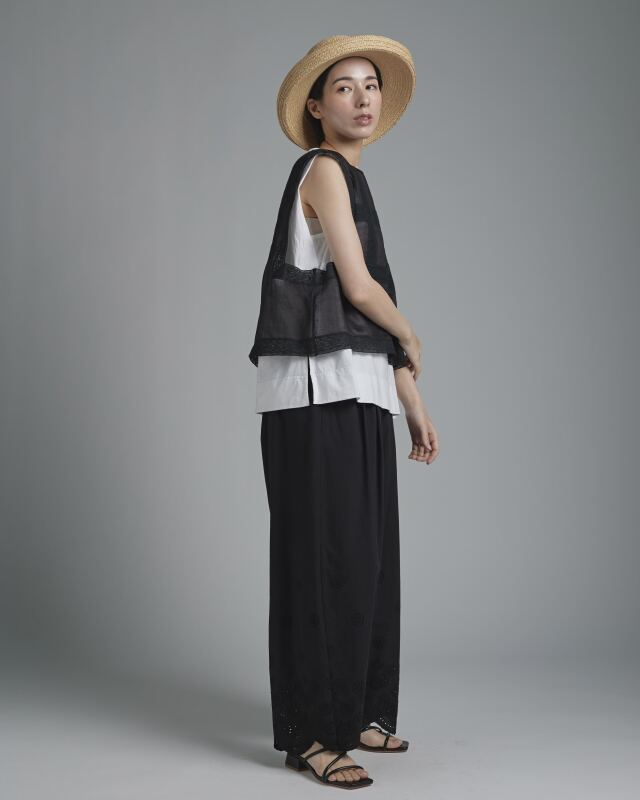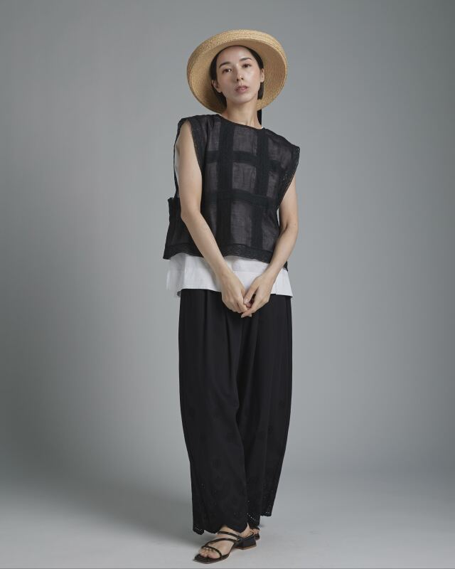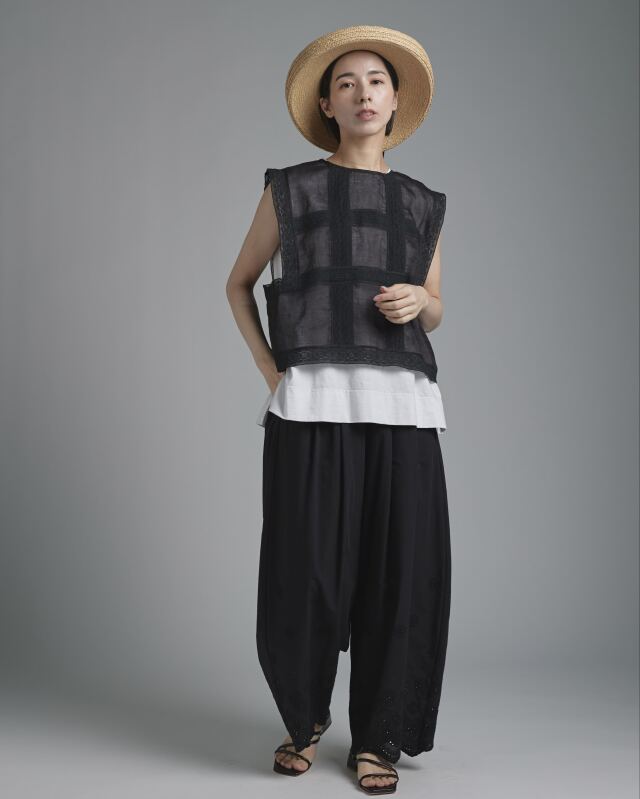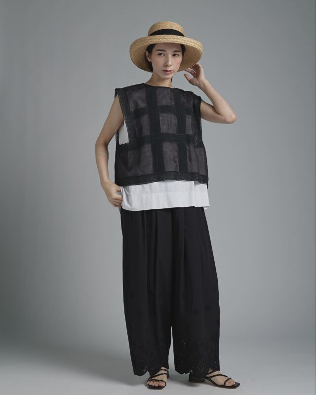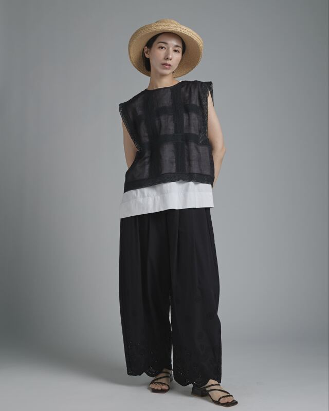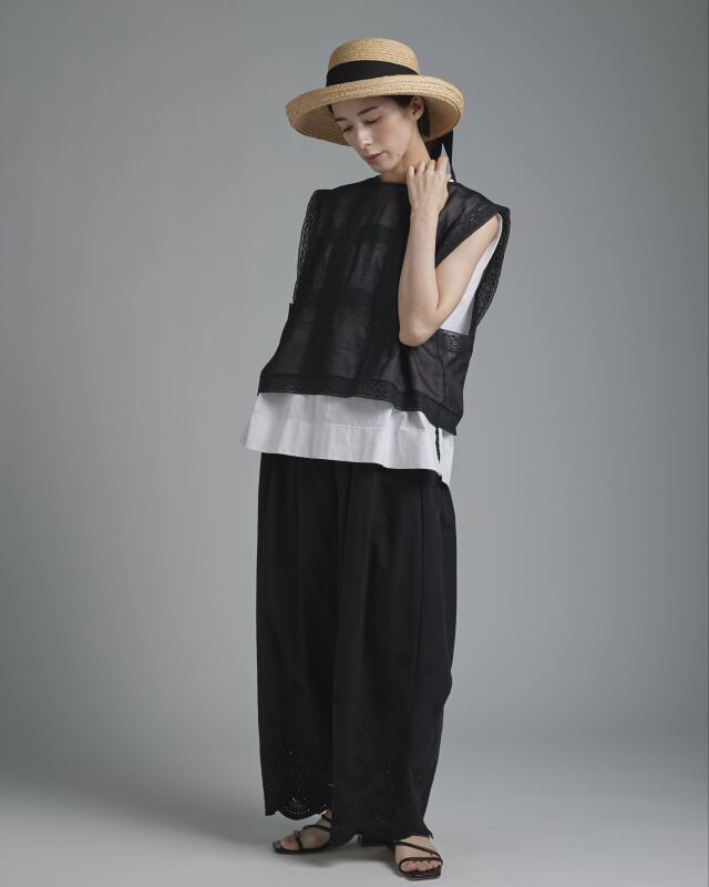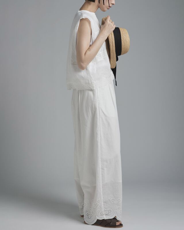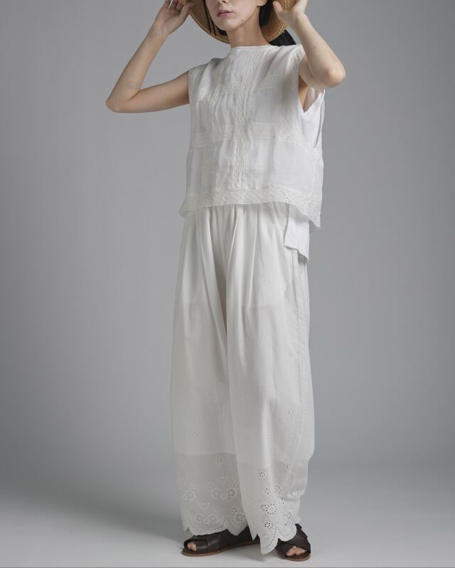 小花の刺繍と波状のカットが印象的な、綿レース素材を使用。やわらかな表情を持ちながら、綿ならではの軽さがあり、暑い季節にも心地よく取り入れられます。刺繍の陰影が控えめで、甘さを抑えた印象です。