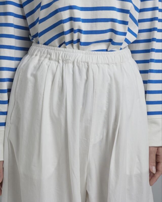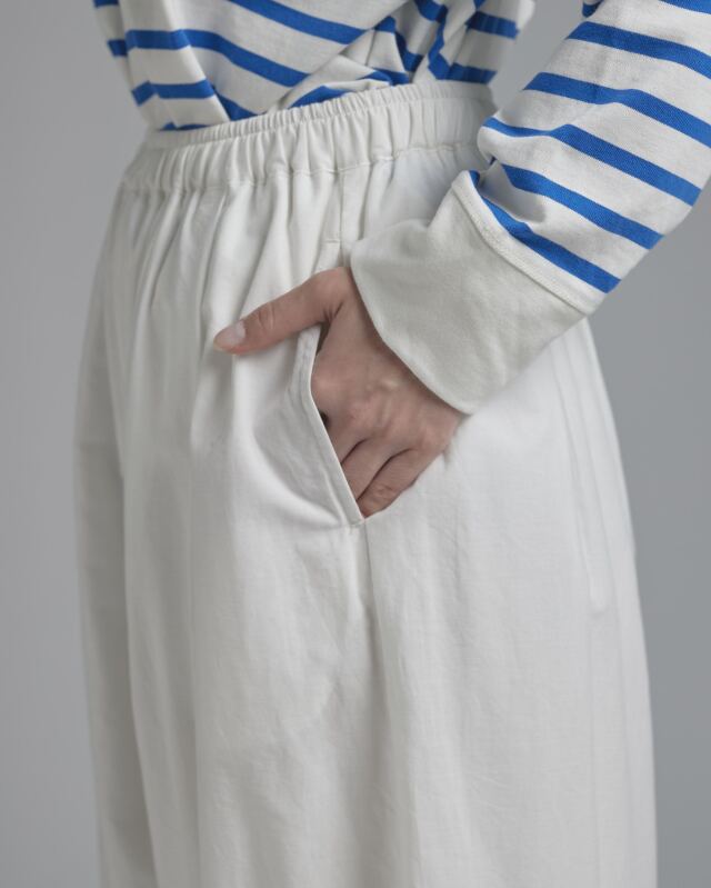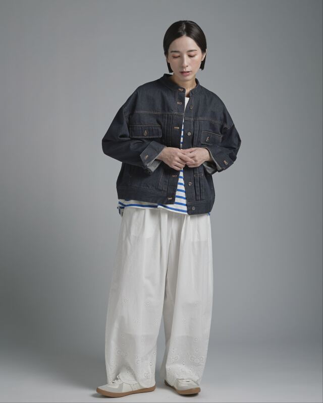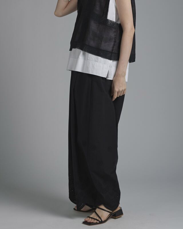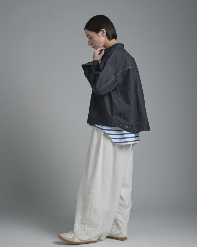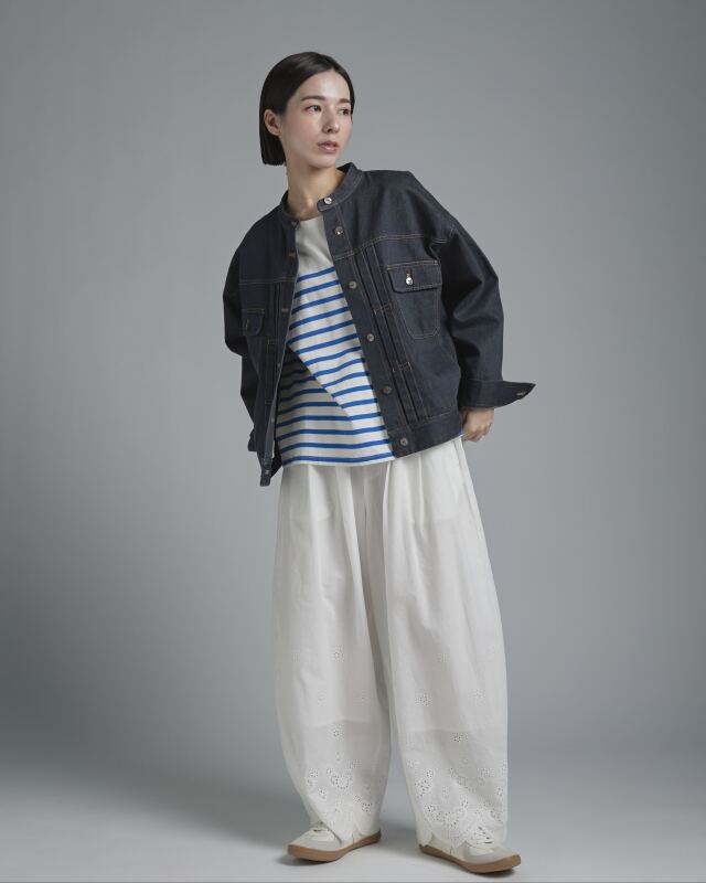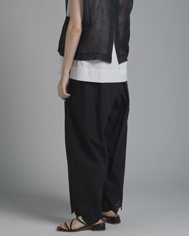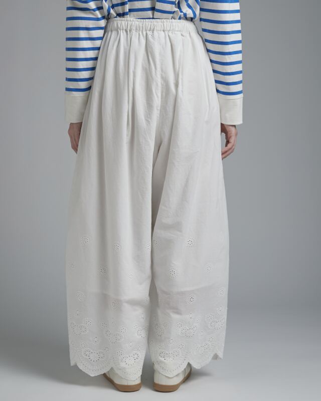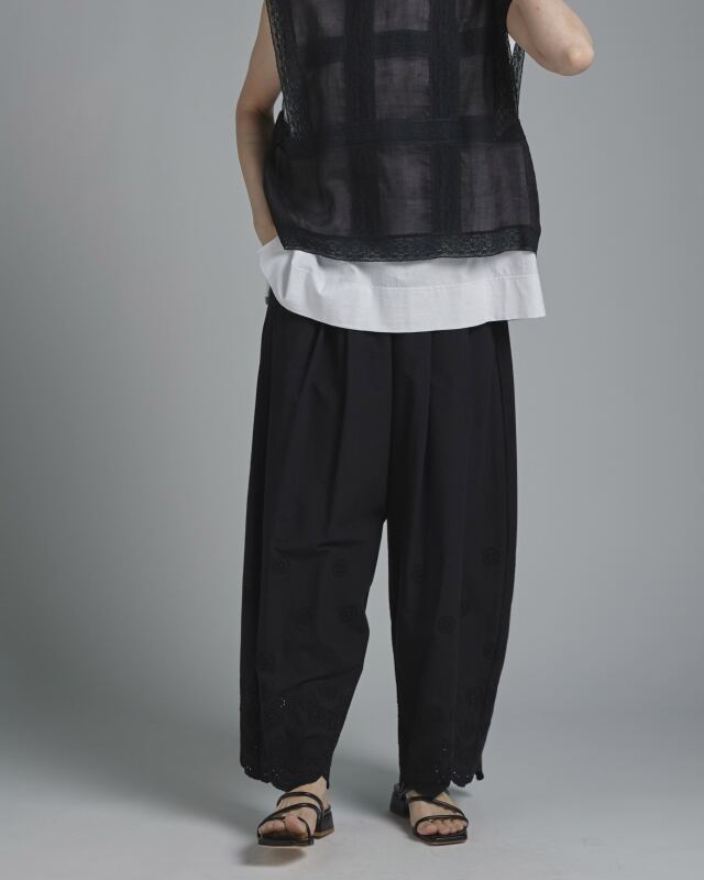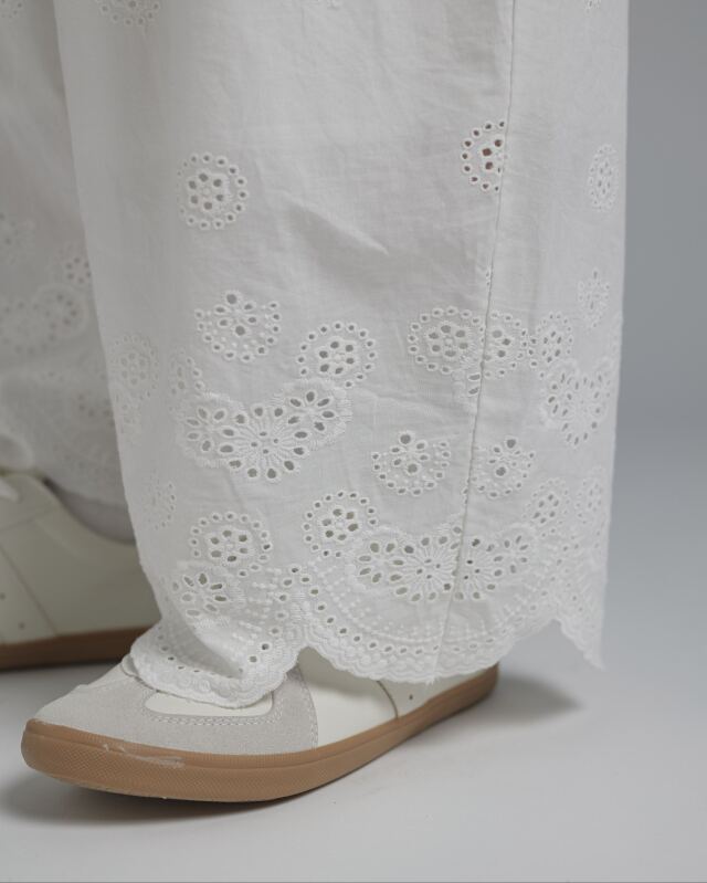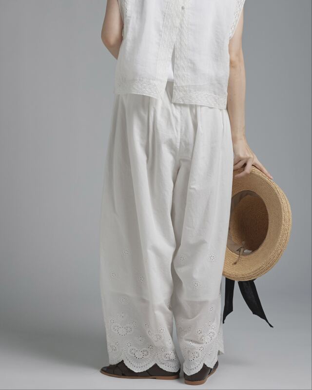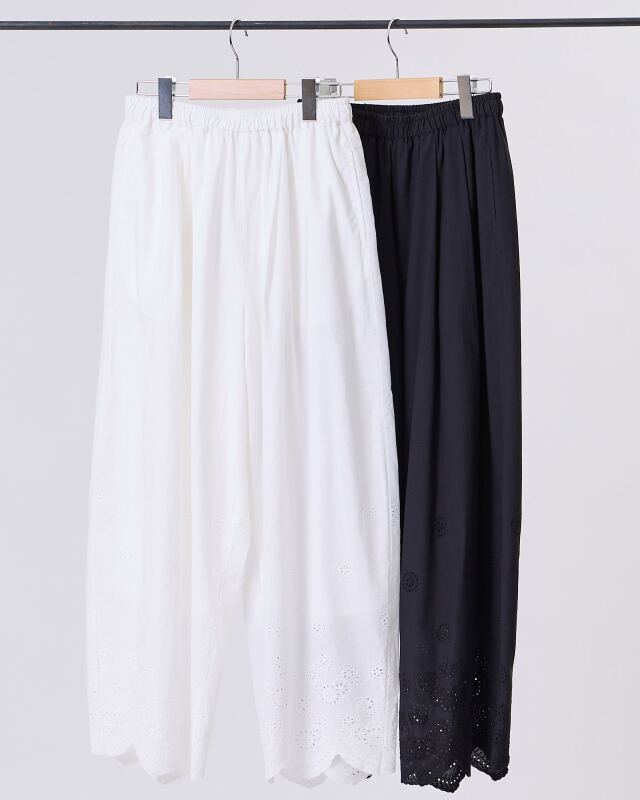 シルエットはベーシックなパンツラインに仕上げ、裾のみにスカラップレースを配置。主張しすぎないデザインが、足元をすっきりと軽やかに見せてくれます。シンプルなトップスと合わせても、程よい華やかさが自然に引き立ちます。